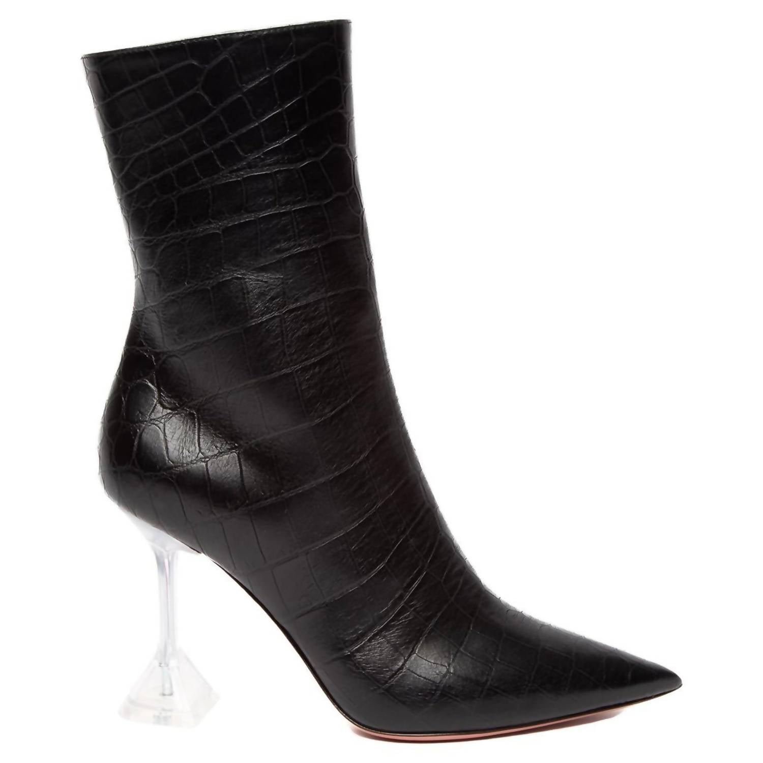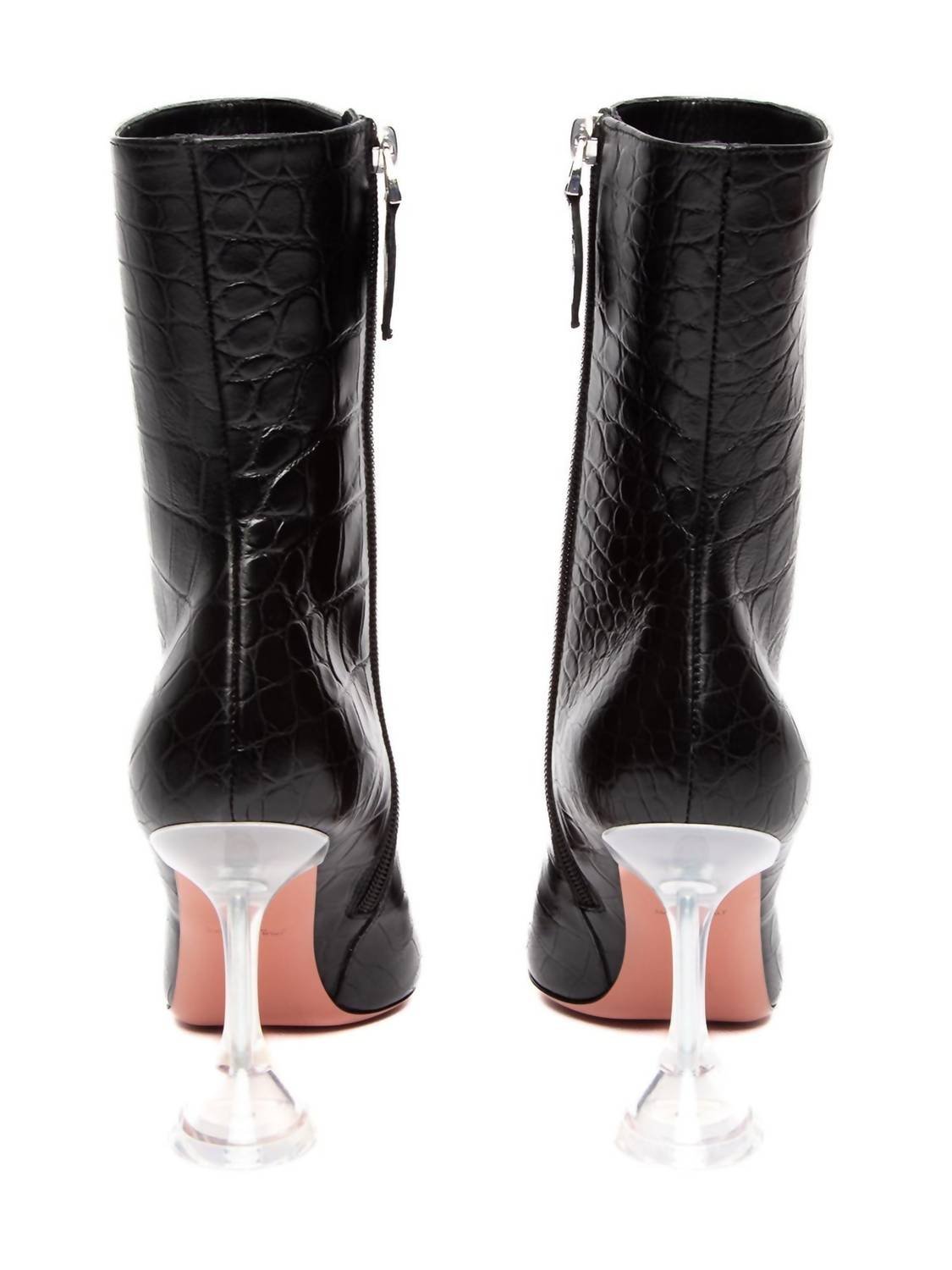 Step into sophistication with the Women's Giorgia Croc Leather Mid-calf Boots by AMINA MUADDI, a standout choice for any holiday party. These stylish black boots elevate minimalist fashion with their crocodile-embossed leather and a high sculpted spool heel reaching 4 inches. The pointed toe enhances the sleek silhouette, while the side zip fastening ensures convenient wear. Perfect for the spring season, these boots promise to be both a fashion statement and a reliable addition to your wardrobe.