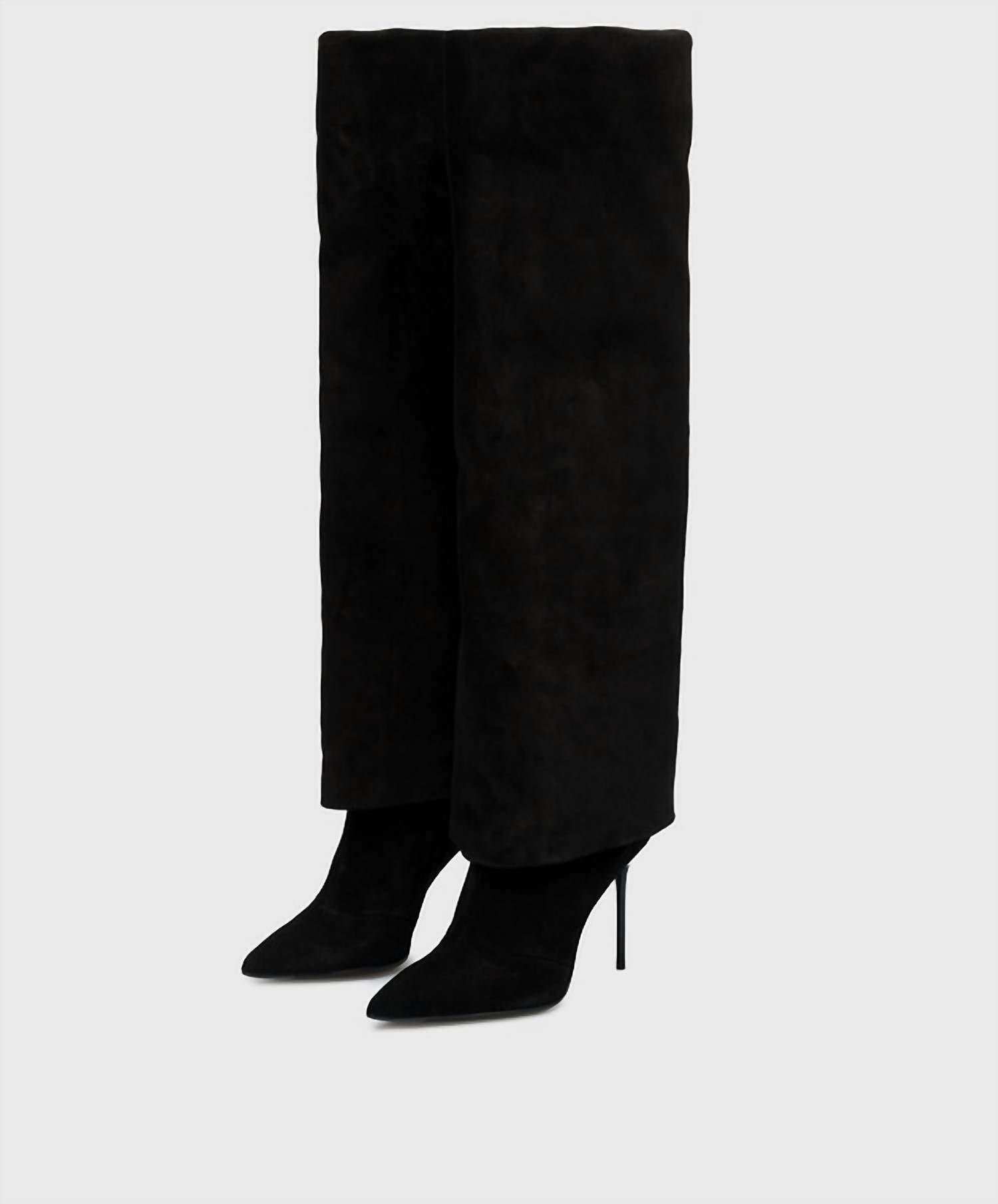 These over the knee boots are equal parts classic and cool.Step confidently with the Women's Arielle Calfskin Knee High Boots by Balmain, a sophisticated choice for a stylish wardrobe. Made from premium calfskin, these black over-the-knee boots feature an adjustable height, creating an illusion of trouser bottoms on the shoe. The stiletto heel stands at a graceful 3.74 inches, paired with a pointed toe for an elegant silhouette. Crafted in Italy, they boast a leather outsole, smooth leather lining, a lacquered heel, and an embossed Balmain Paris logo underfoot.