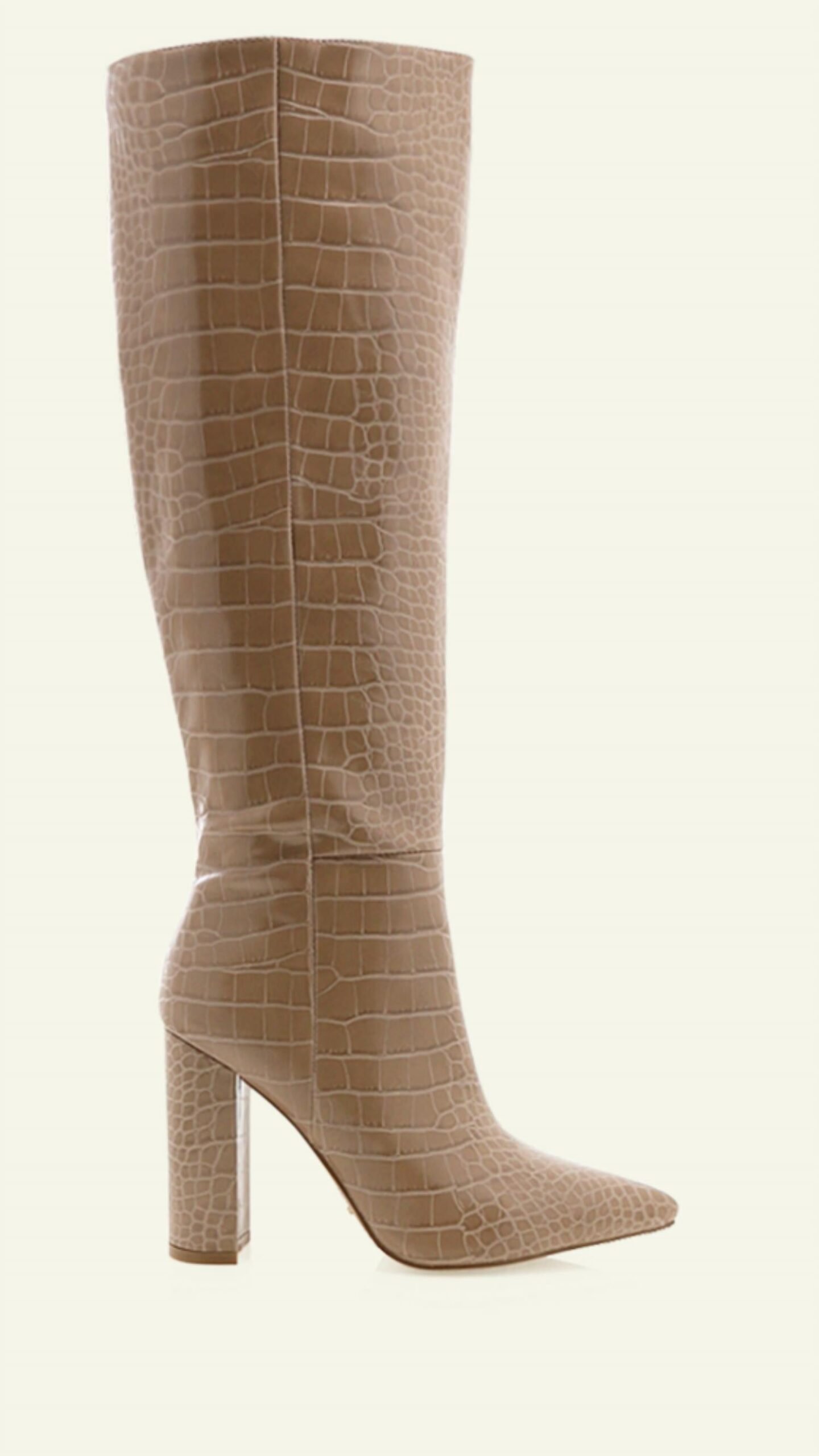 A stylish boot with a comfortable fit and the perfect amount of height. These classic boots are the perfect addition to any outfit and can be worn season after season.The Milla Long Boot by Billini makes a bold statement in your winter wardrobe with its luxe croc look. This women's heeled boot in light taupe features a high self-covered block heel of 10.5cm, a sharp tapered toe shape, and a straight long boot upper that cuts just below the knee. Crafted from synthetic material for the upper, lining, and outsole, it boasts a faux croc fabrication for a chic appearance. Closure: Inner zipper fastening.