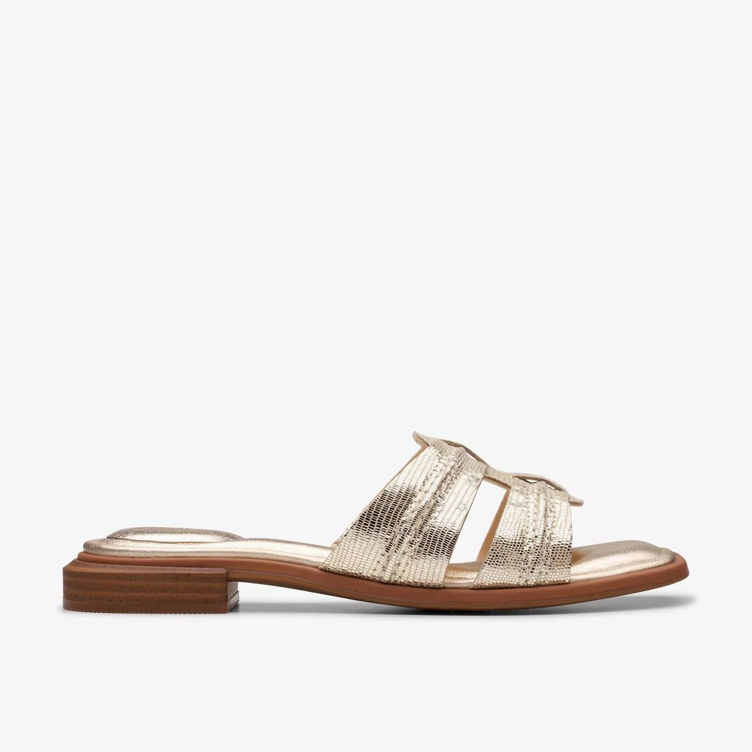 This sandal will take you from brunch to dinner and everything in between.Step into sleek sophistication with the Women's Ariany Mule by Clarks, featuring a modern open toe design in a stunning champagne leather. These sandals provide ultimate comfort with a molded leather Contour Cushion footbed and expertly targeted foam for superior underfoot cushioning. A slip-on profile ensures easy on/off wear, while a subtle hidden elastic offers a personalized fit. The lightweight, flexible rubber outsole and a 20mm flat heel height make these the perfect choice for any outing this spring.