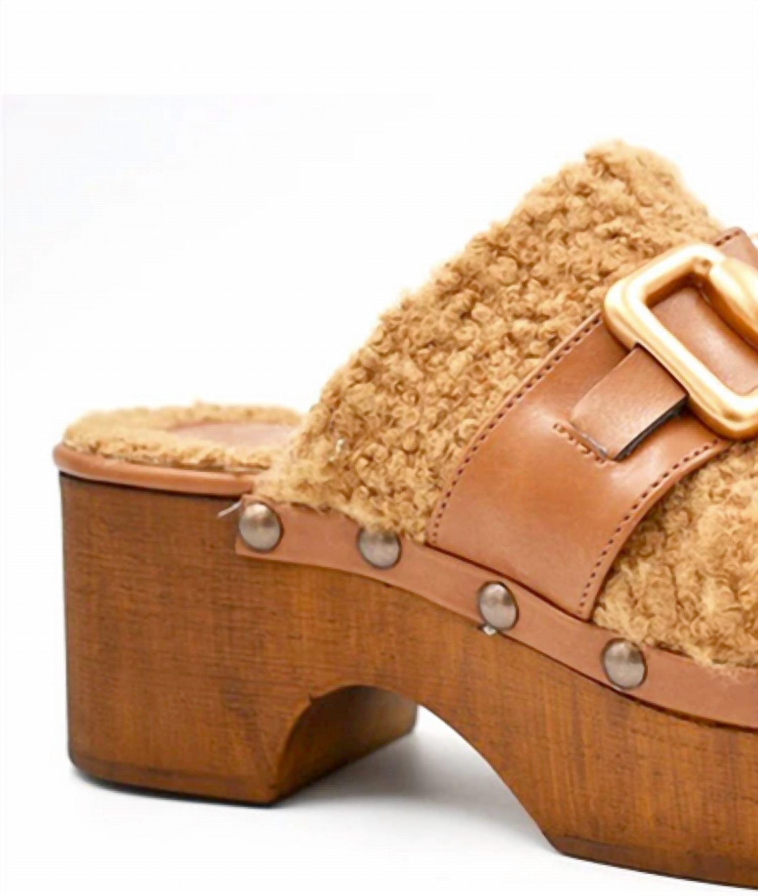 Step into sophisticated style with the Women's Winona Bit Clogs by CORDANI, perfect for a minimalist holiday party look. These cuoio-colored clogs feature a faux shearling upper with a matching buckle and stud detail on a wood-like platform heel. Made in Italy, they boast a lightly padded footbed, leather lining, and a rubber sole for comfort and durability. With a heel height of 2.75 inches and a platform height of 1.75 inches, they offer a chic lift while ensuring all-day comfort.