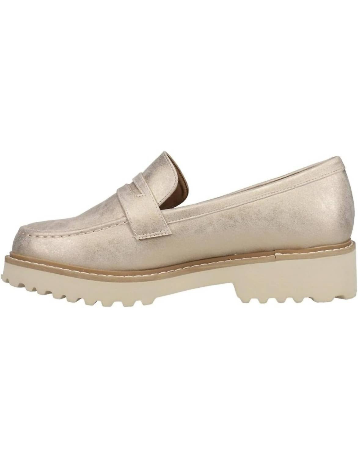 A preppy yet feminine take on the classic loafer.Slip into elegance with the Women's Boost Gold Metallic Loafers by Corkys Footwear, crafted from luxurious faux suede. These chic loafers boast a sophisticated round-toe design, set on a low, chunky 1.5′ heel, perfect for a stylish and comfortable stride. Ideal for summer occasions, including anniversaries and Christmas celebrations, they embody the quiet luxury trend. Enjoy effortless style with these versatile loafers that seamlessly complement any wardrobe.