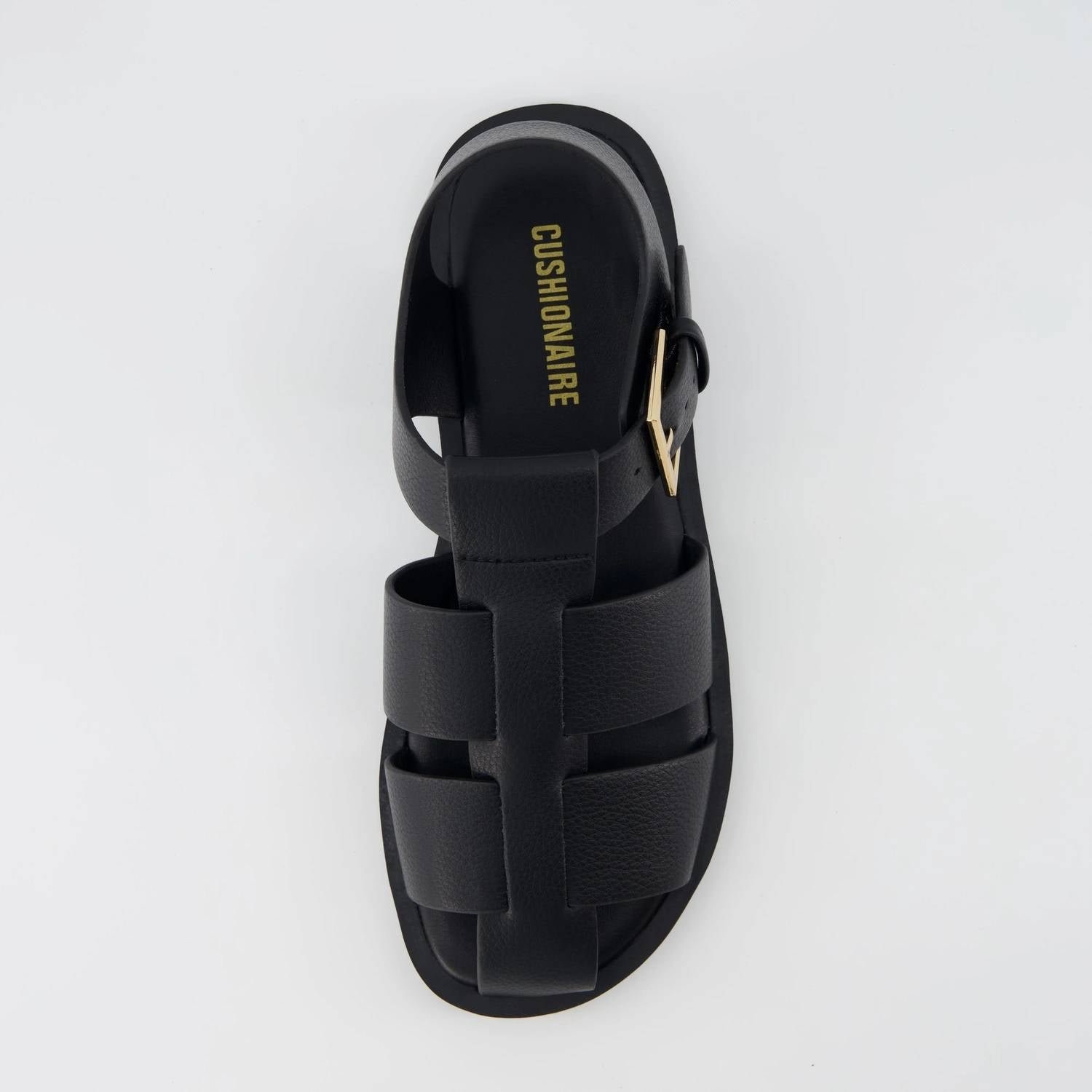 This sandal will take you from brunch to dinner and everything in between.Introducing the Women's Plaza Fisherman Sandal by Cushionaire, a perfect blend of timeless design and modern comfort. Crafted from soft and durable vegan leather, these black smooth sandals feature wide straps for stability and an adjustable buckle for a personalized fit. Enjoy the superior comfort of a cushioned memory foam footbed, ideal for all-day wear. Lightweight yet durable, they boast a flexible outsole for confident stepping during any warm-weather adventure or casual outing.