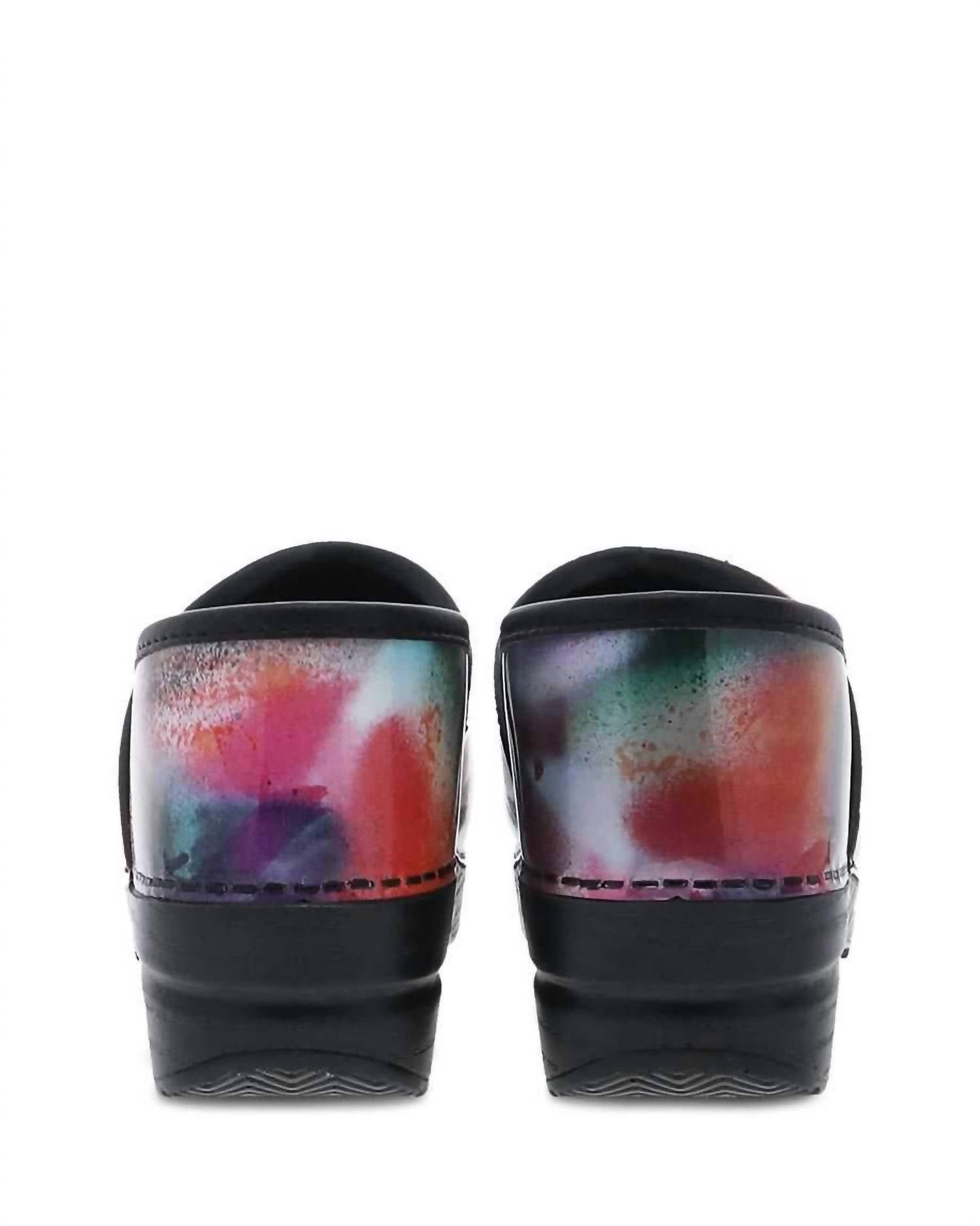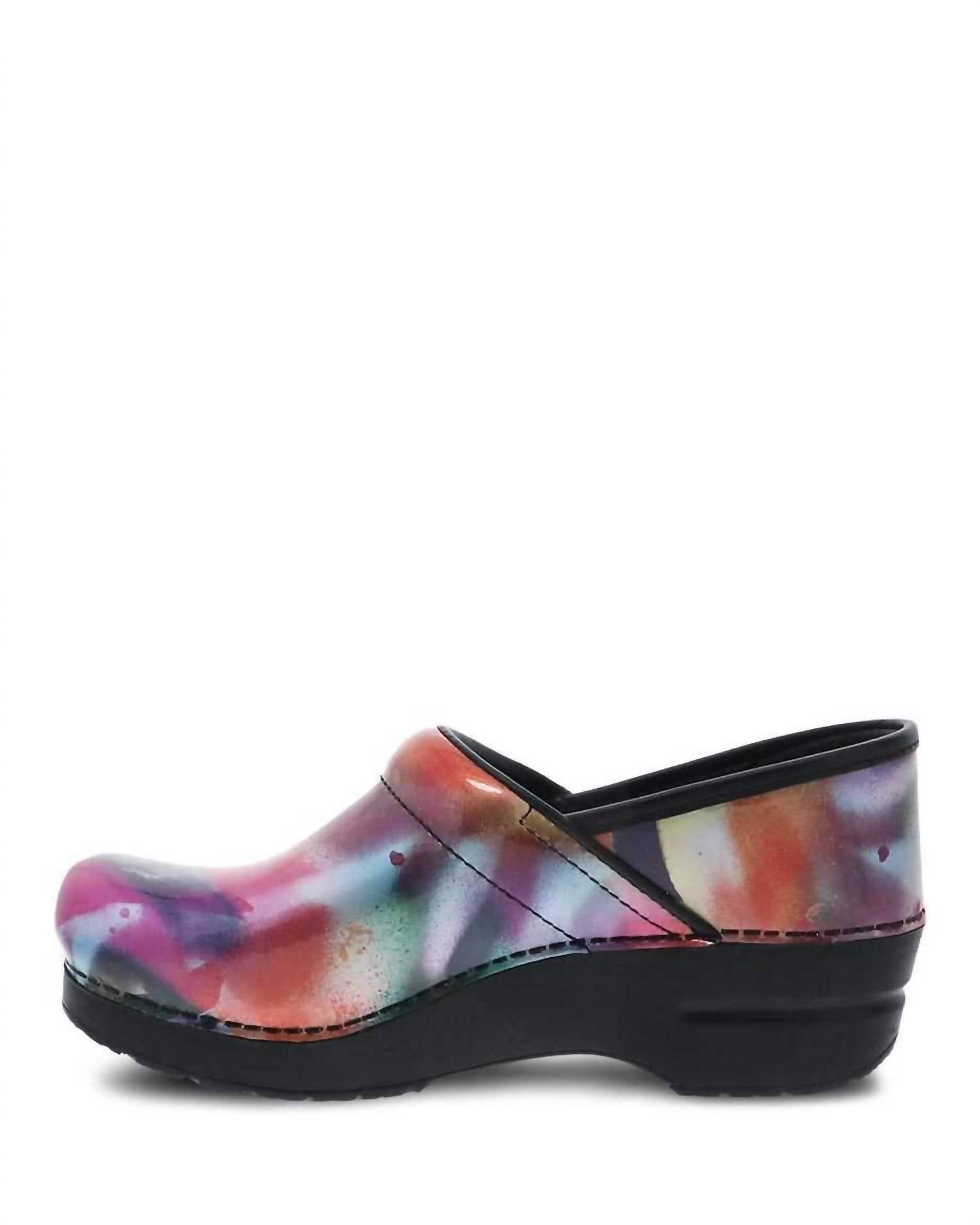 Stylish, comfy, and versatile. We can't find anything wrong with these.Step out in style with the Women's Professional Patent Spray Paint Mules by Dansko, combining maximalist flair with practical comfort. Designed with leather uppers and a roomy round toe box, these mules offer all-day ease with a padded instep collar and slip-resistant rubber outsole. The removable dual density PU footbed and TPU arch stabilizer ensure exceptional support, while the lightweight EVA midsole enhances stability and shock absorption. With a heel height of 1.75′, these clogs are perfect for vacations and everyday wear, effortlessly suited for diverse surfaces.