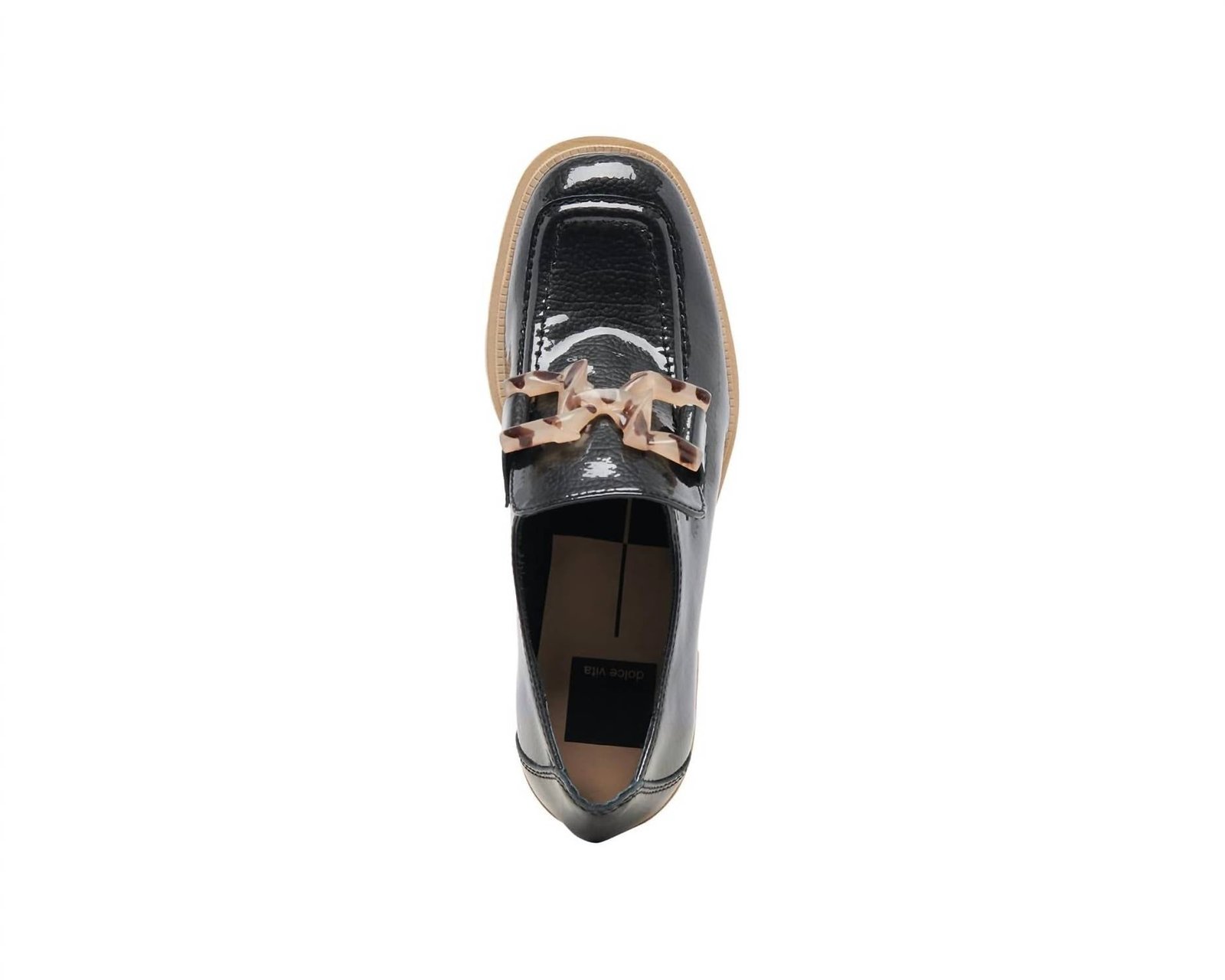 A preppy yet feminine take on the classic loafer.Embrace vintage-inspired style with the Women's Harold Loafer by Dolce Vita in Midnight Patent Leather. This loafer features a block heel with a 1.2′ height, complemented by a 0.4′ platform for added lift and comfort. The construction includes a leather upper, recycled synthetic outsole, and a cushioned recycled cotton twill lining. Designed with a round toe and modern chain detailing, this shoe is a chic choice for both mini skirts and wide-leg denim. Imported and crafted with at least 20% recycled material content, it's perfect for a spring dinner party or New Year's Eve celebration.