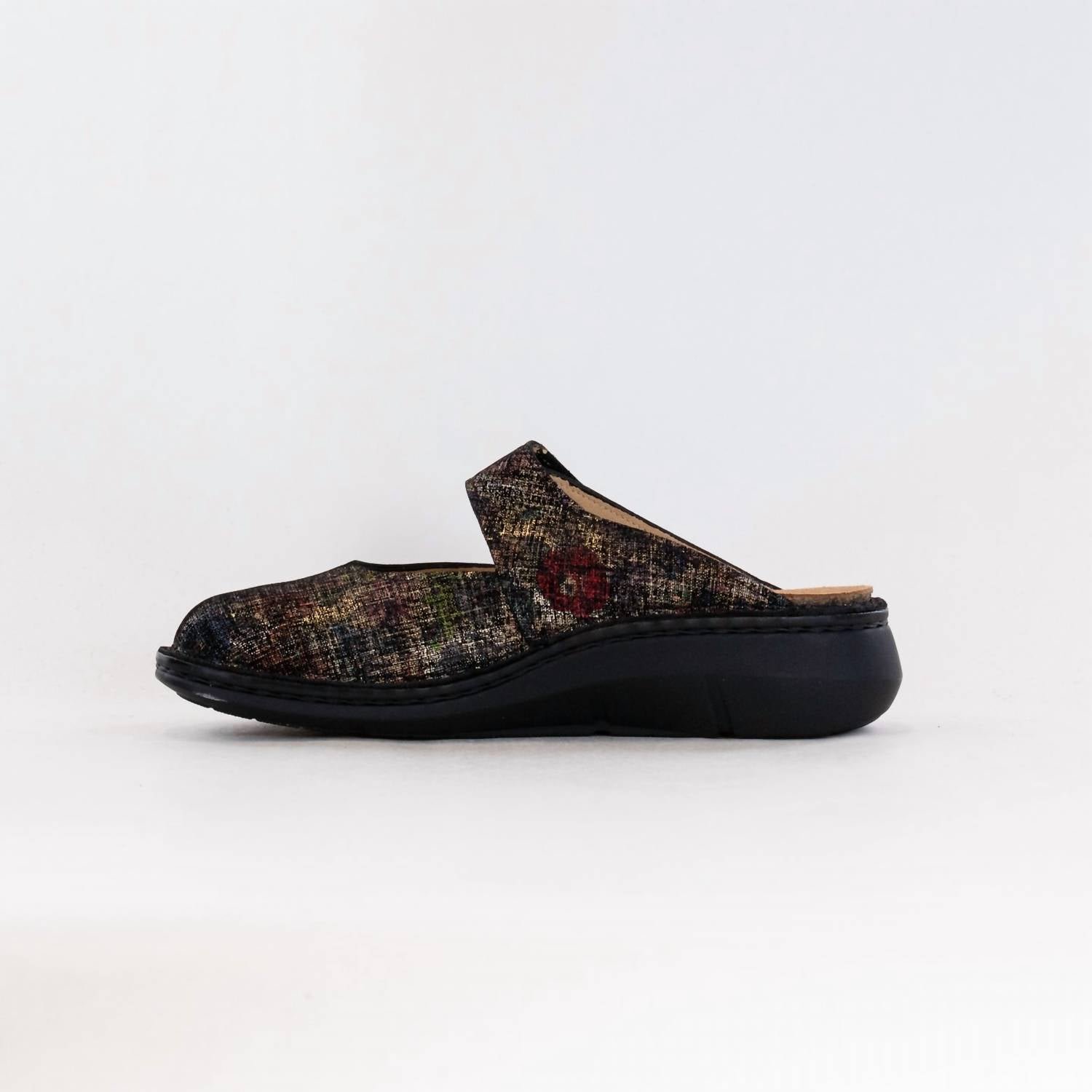 A trend that everyone is loving and this style might just be our favorite.Step into ultimate comfort and style with the Women's Roseau Sandal by Finn Comfort, a classic mule featuring a premium leather upper. This versatile clog in a vibrant Multi Brokat color includes an adjustable hook and loop strap for a customized fit. With a flexible PU outsole that is handstitched to the upper, and a removable footbed made of suede leather, jute, and cork, it promises superior comfort and support. Ideal for streetwear and travel occasions, it boasts a 25mm heel height, offering a standard to wide fit and a round toe shape perfect for spring adventures.