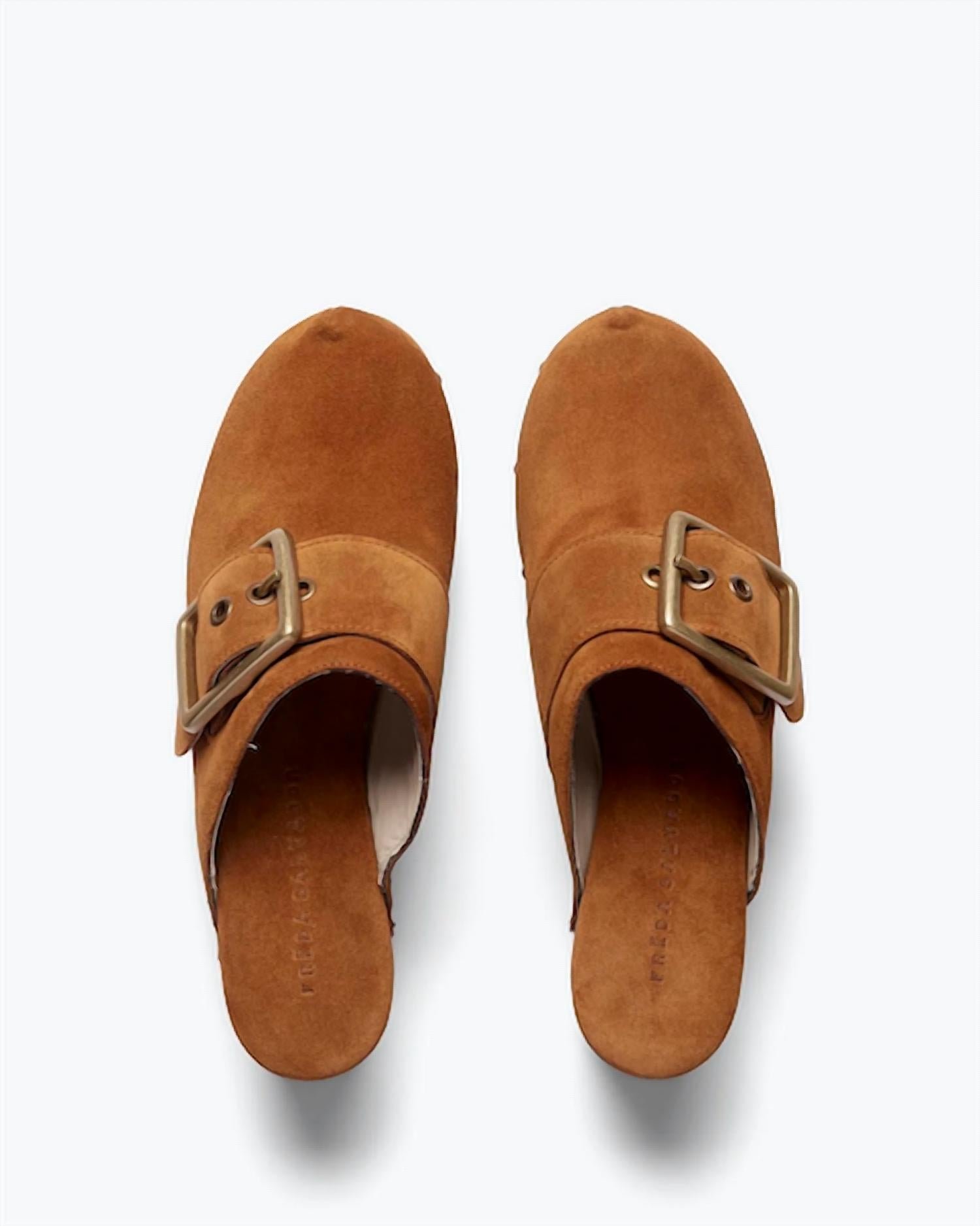 Stylish, comfy, and versatile. We can't find anything wrong with these.Step into sophistication with the Women's Jazz Clog by FREDA SALVADOR, a chic mule crafted with bronze suede leather. 100% Spanish Leather. Featuring a round toe and a classic wooden platform sole, these clogs boast a 2.25-inch mid-height heel, perfect for a stylish yet comfortable lift. The slip-on design, accentuated by a statement buckle and cool studs, makes these versatile shoes ideal for both holiday parties and workwear during the spring season. Enjoy the effortless elegance of these must-have clogs designed for the modern woman.