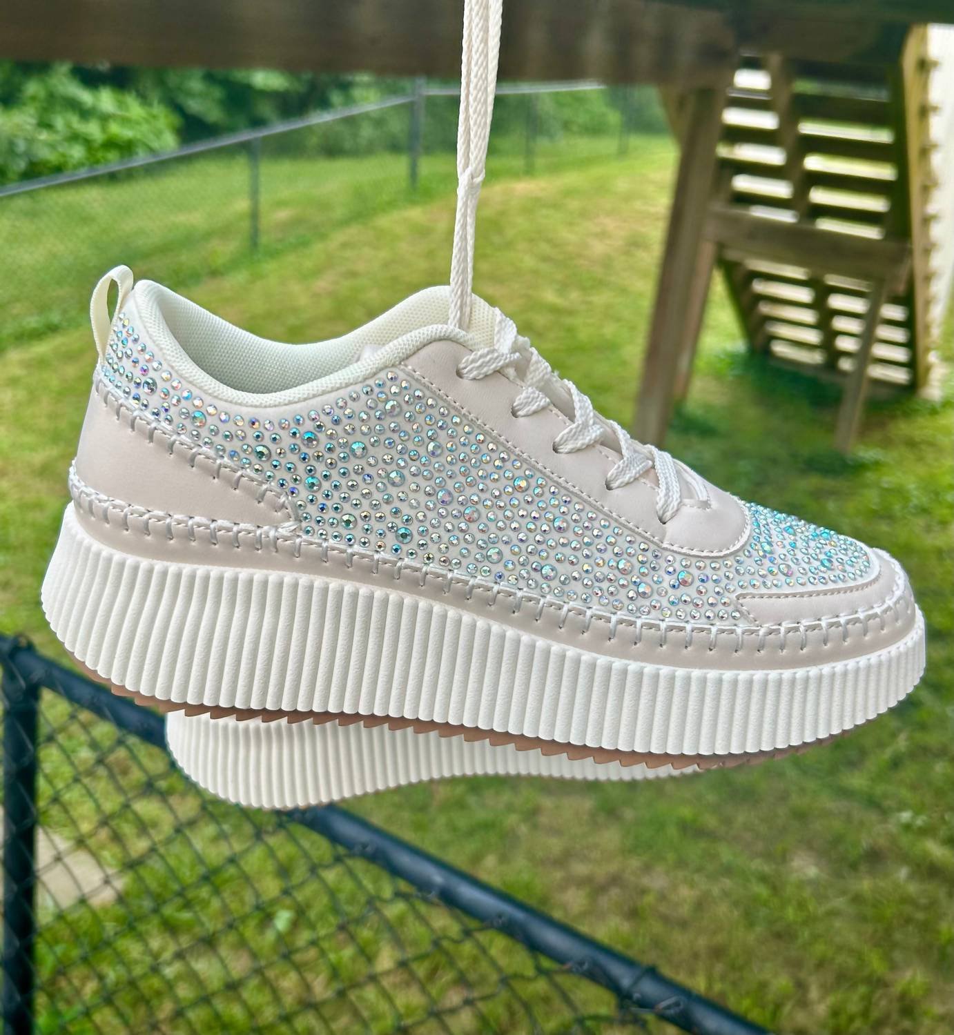 Get your daily steps in with these adorable sneakers.These sneakers are adorned with shimmering rhinestones, featuring a round toe shape and a platform sole that provides both height and style. The soft, cushioned interior ensures all-day comfort, making them perfect for parties, festivals, or adding sparkle to your everyday look. For half sizes, it's recommended to size up to the next whole size.