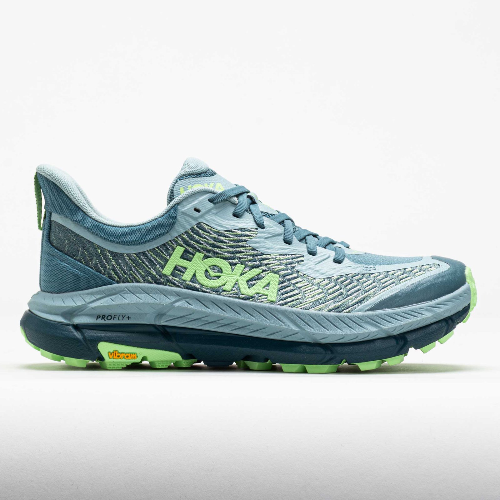 Enjoy a responsive ride on rugged terrain in the Hoka Mafate Speed 4! This sturdy trail shoe thrives on uneven surfaces. providing durable protection with every stride. Slide into a breathable. single-layer jacquard mesh upper and enjoy foot-hugging comfort. The dual-layer PROFLY?+ midsole delivers soft landings and explosive lift-offs. Aggressive Vibram? MegaGrip lugs provide smooth landings on uneven surfaces. If you're looking to take your trail runs to new heights. try the Hoka Mafate Speed 4!