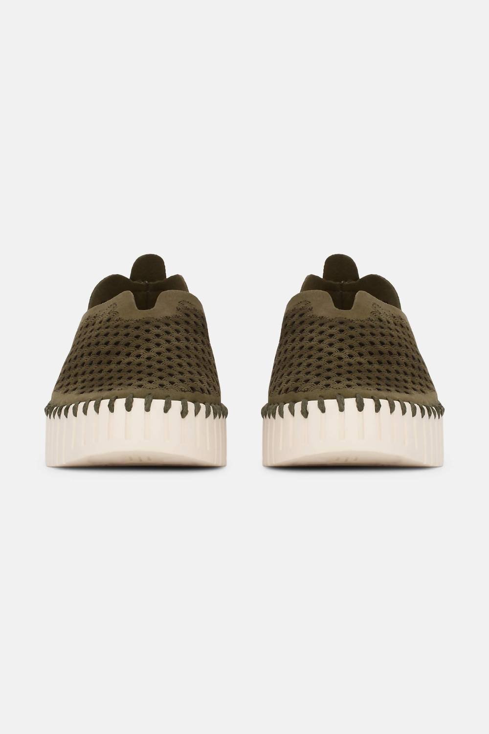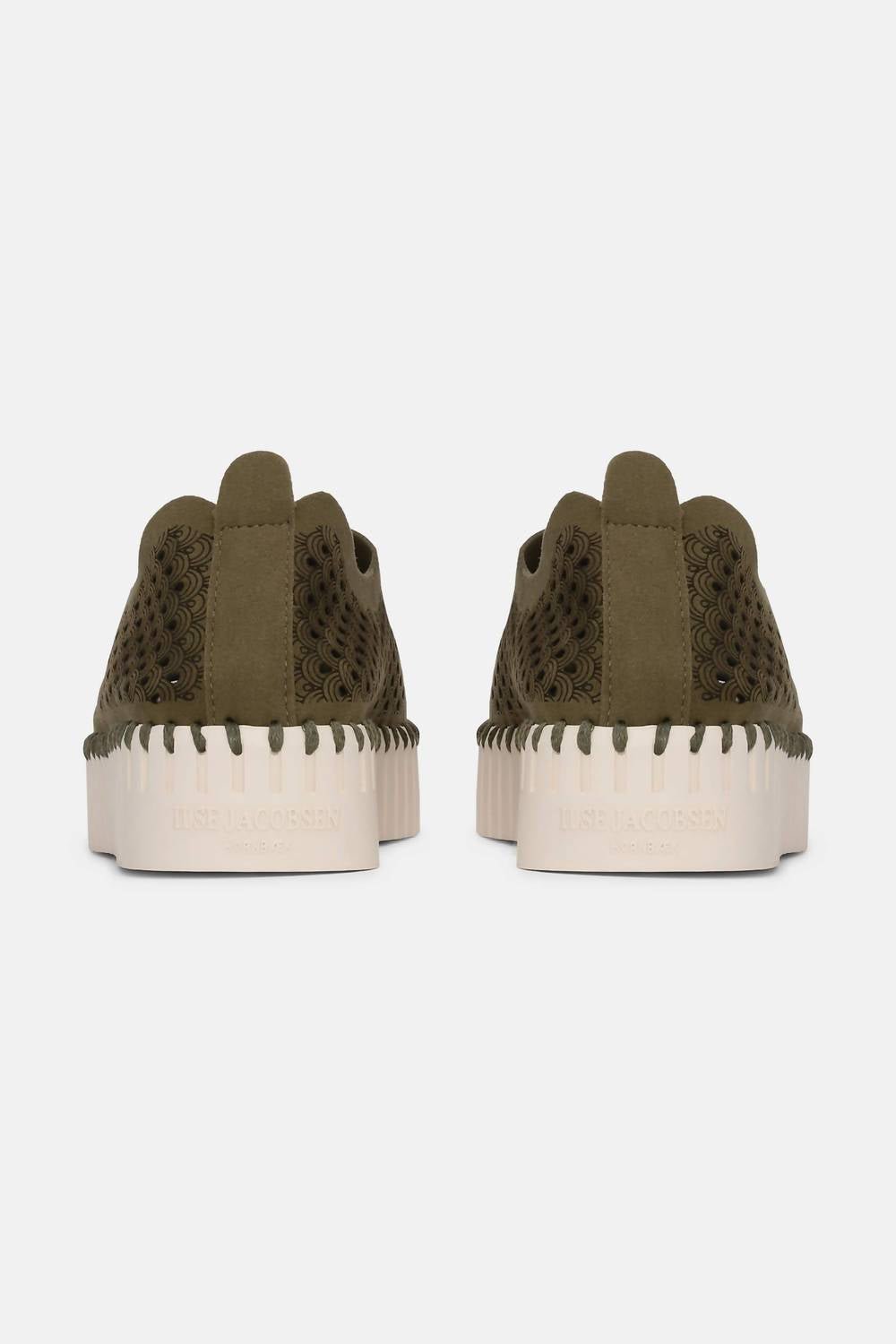 A classic loafer that is both comfortable and polished.Step up your style game with the Women's Platform Tulip Slip-on by Ilse Jacobsen in an elegant Deep Olive shade. These flats feature a recycled microfiber upper with intricate laser-cut details and a modern platform Tulip outsole offering a low heel height of 1 1/4′-2′. The design ensures comfort and ease with a glue-free construction stitched using color-matched recycled thread, all while providing support through a softly padded insole with arch cushioning. Composition includes a 60% Nylon, 40% Polyurethane upper, while the outsole is made from 75% Natural Rubber, 25% Recycled Rubber, and the insole combines 60% EVA with 40% Pig Suede.