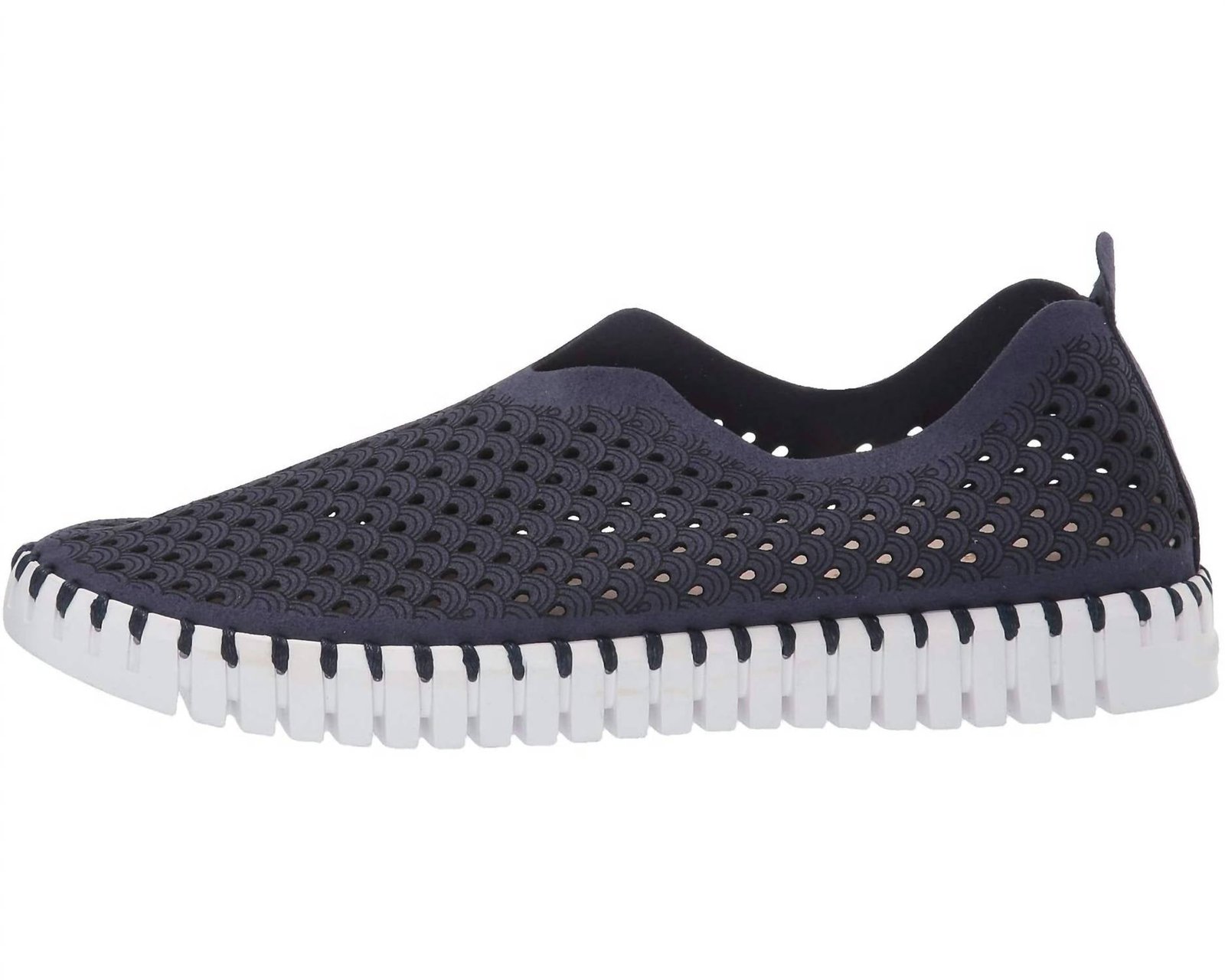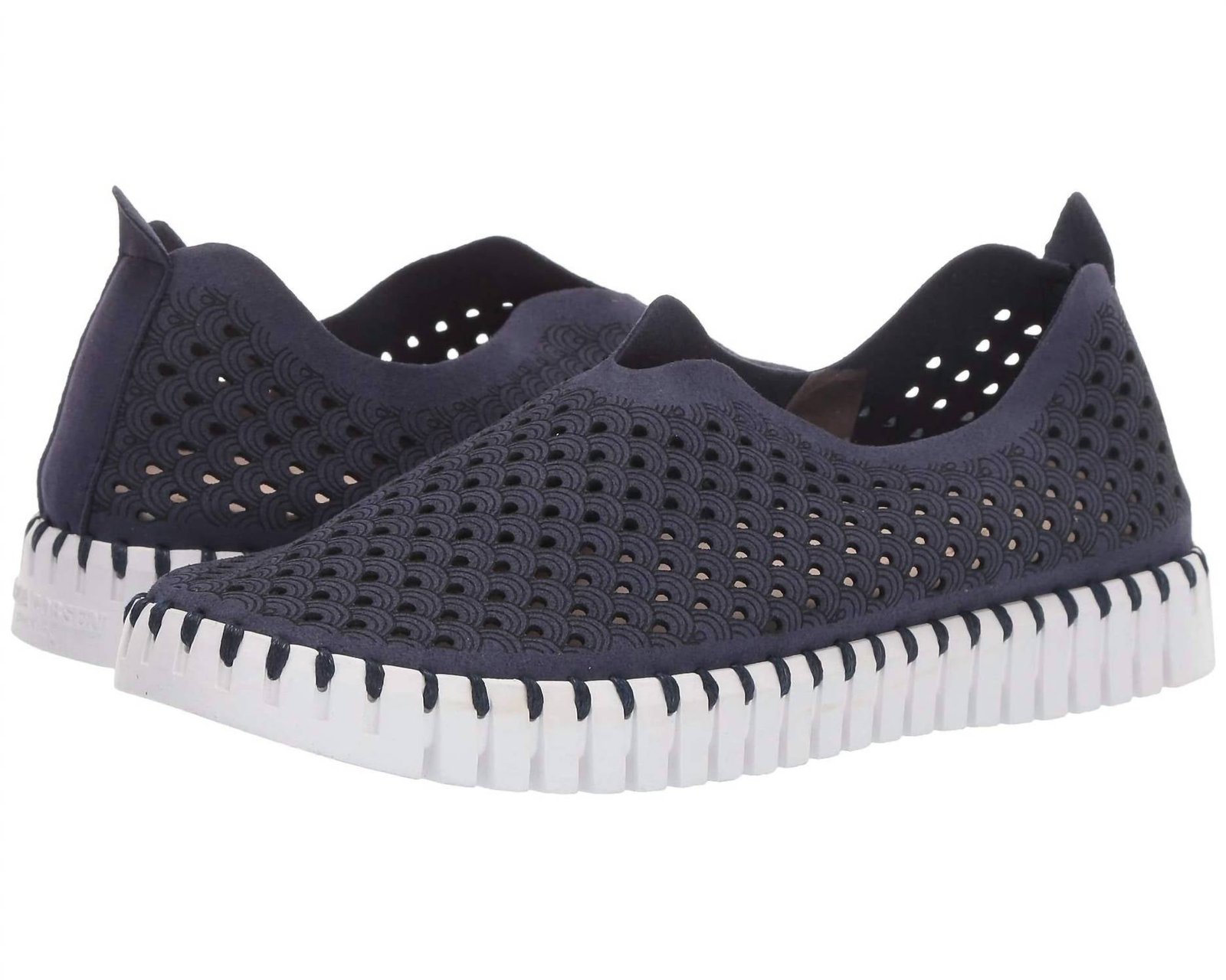 Loafers so versatile you can wear them with just about anything.Discover the Women's Tulip 139 Shoe by Ilse Jacobsen, a minimalist flat perfect for summer occasions. In a versatile navy shade, this casual loafer features a breathable upper with a laser-cut pattern, balanced on a flexible outsole crafted from natural rubber. Designed with a round toe shape and flat heel height under 1 inch, this shoe combines style and practicality. Ideal for travel, the upper construction uses recycled microfiber and is crafted without any glue, ensuring both comfort and fashion.