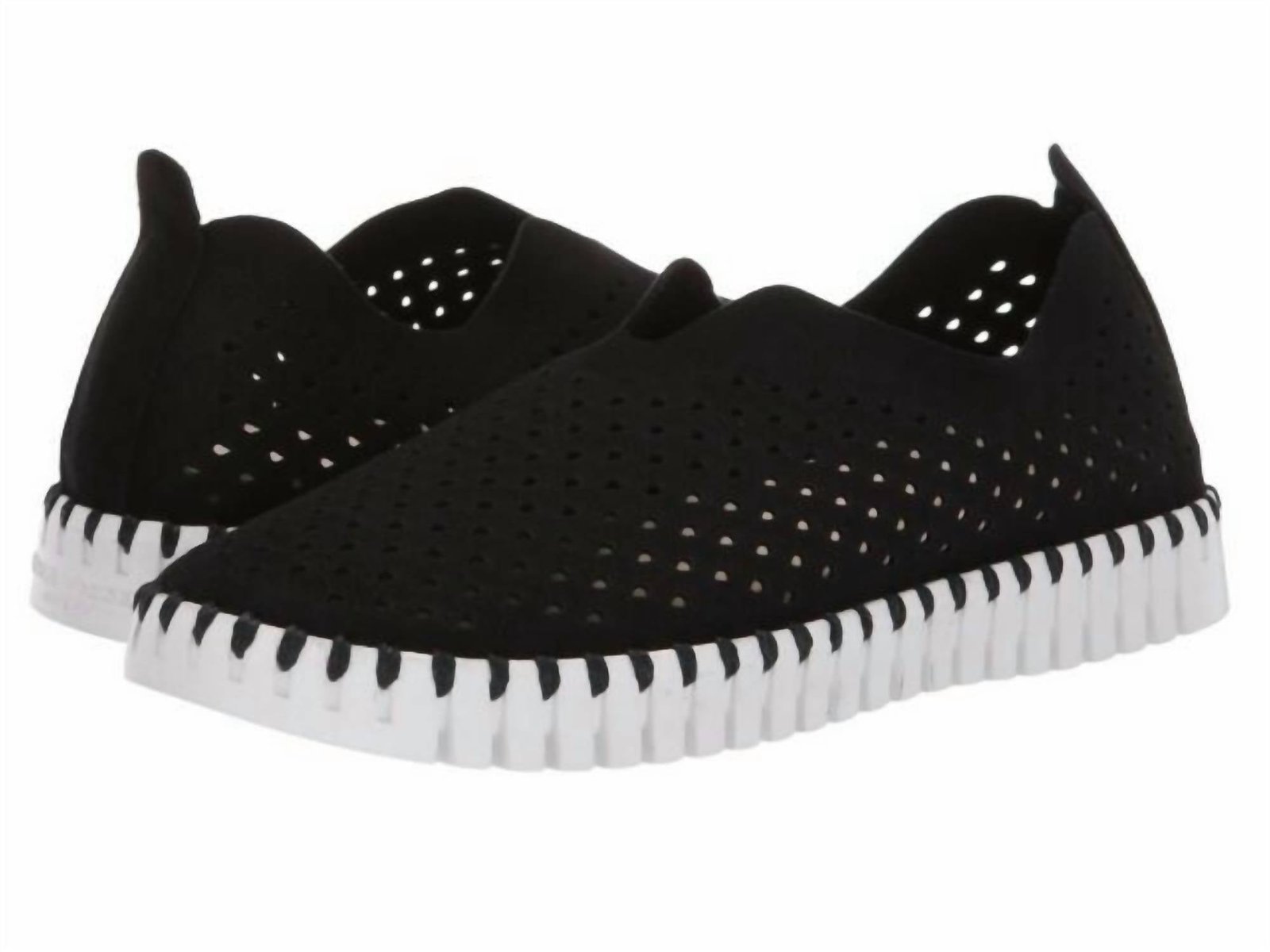 A preppy yet feminine take on the classic loafer.Introducing the Women's Tulip Ballet Flats by Ilse Jacobsen, a stylish and comfortable choice for summer vacations and Mother's Day. Featuring a recycled microfiber upper with etched scallop detail and perforations, these flats offer a supportive footbed for all-day wear. The outsole is composed of 75% natural rubber and 25% recycled rubber, emphasizing a commitment to sustainability. The flats are uniquely crafted with match-colored recycled thread, eliminating the need for glue, and are designed with a flat heel and round toe in classic black.