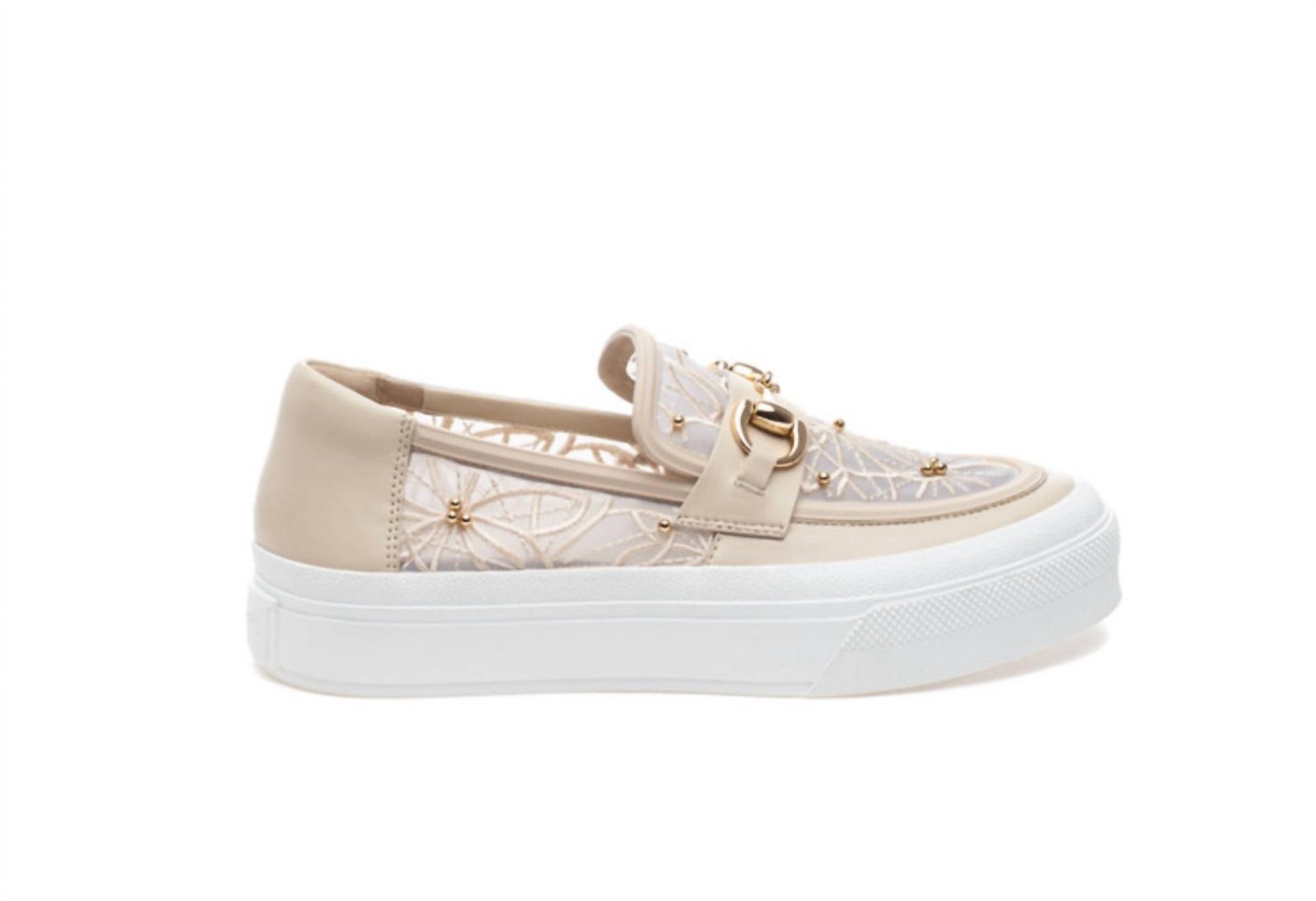 Loafers so versatile you can wear them with just about anything.Step into understated elegance with the Women's Georgy Loafer by J/SLIDES in a refined beige hue. Featuring a lace and leather upper adorned with sophisticated embroidery and gold studs, these loafers boast a chic horsebit buckle detail. The design ensures comfort with a cushioned footbed and removable insole, all set on a practical 1.5′ platform. Ideal for fall travels, these imported loafers echo quiet luxury.
