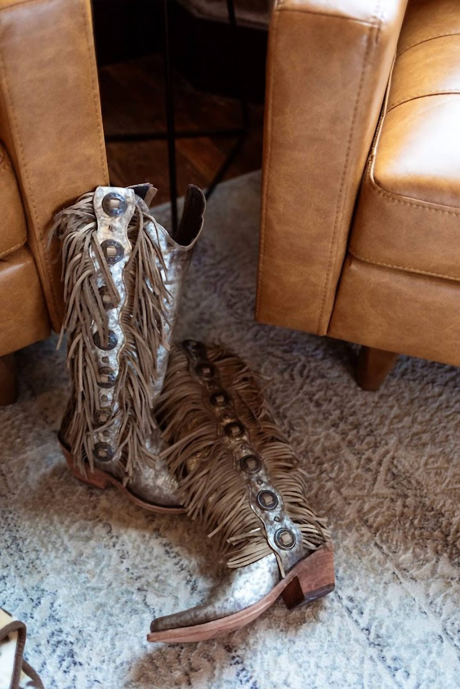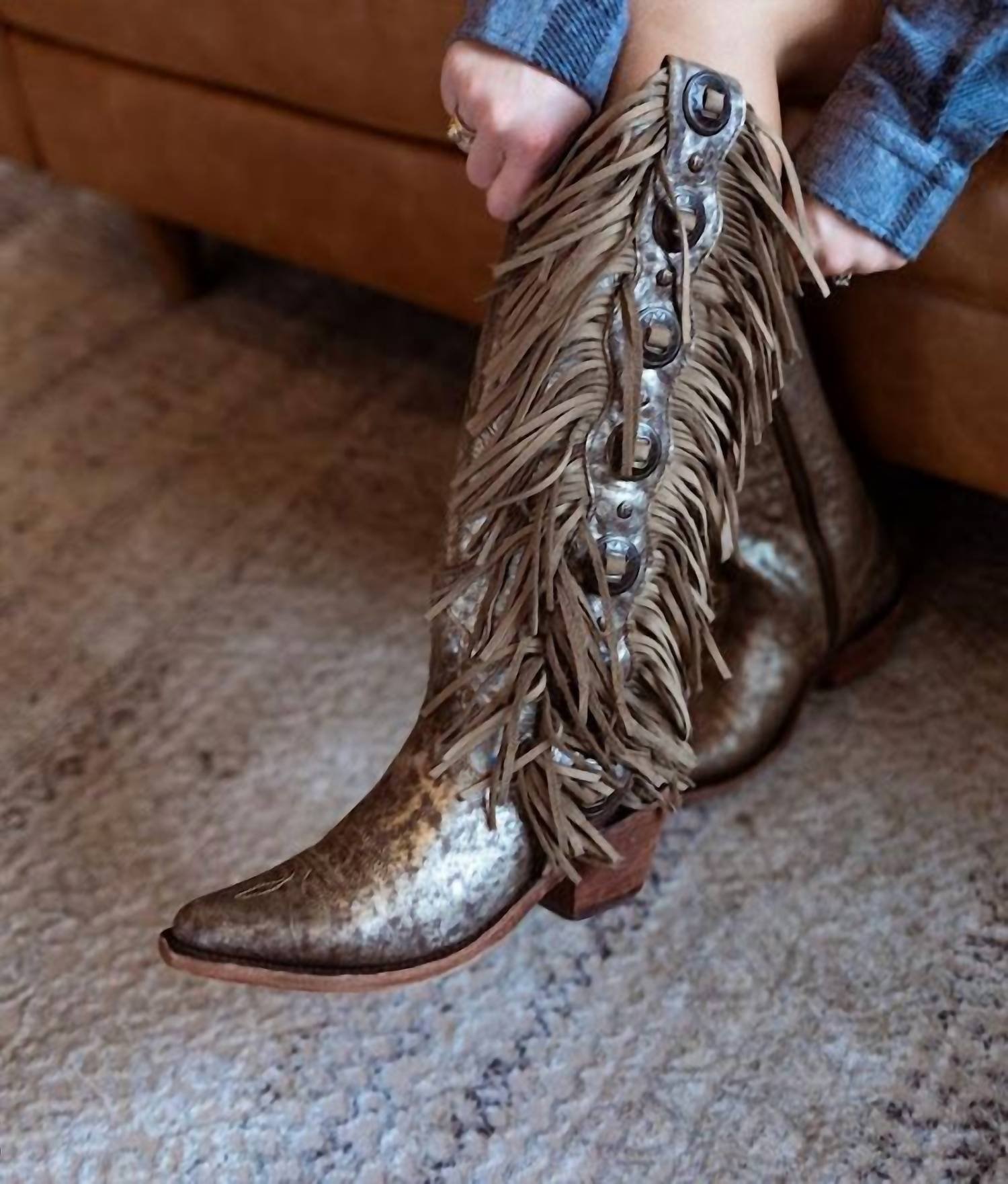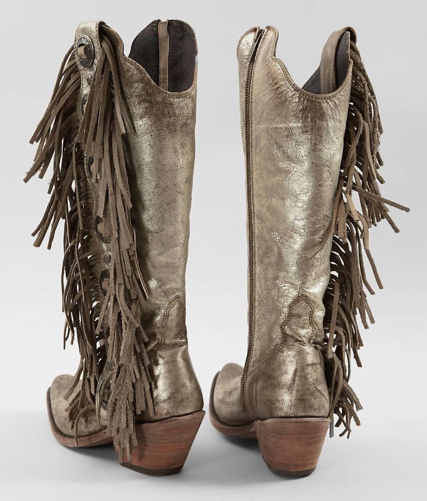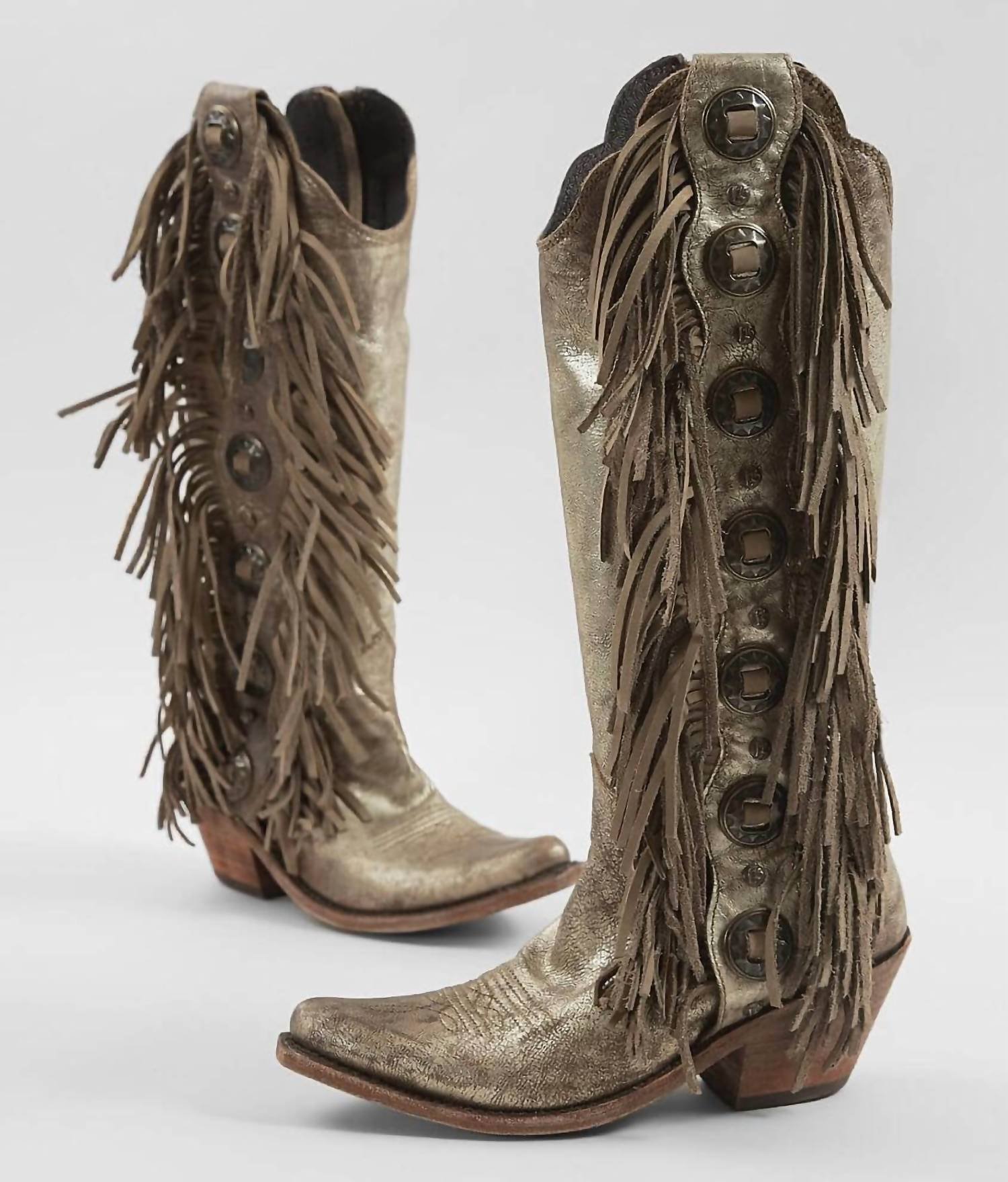 Step out in confidence and showcase your impeccable taste with these fashionable and versatile boots. Their classic style will have you reaching for these boots season after season.Step into style with the Women's Ophelia Fringe Boot by Liberty Black, a stunning addition to any wardrobe. These heeled boots boast a stylish stonewash finish and feature a 16-inch shaft height with a narrow round toe for a sleek silhouette. The 2.5-inch heel height provides an elegant lift, complemented by an easy inside zip closure. Perfect for women seeking a unique touch with conchos and fringe detailing.