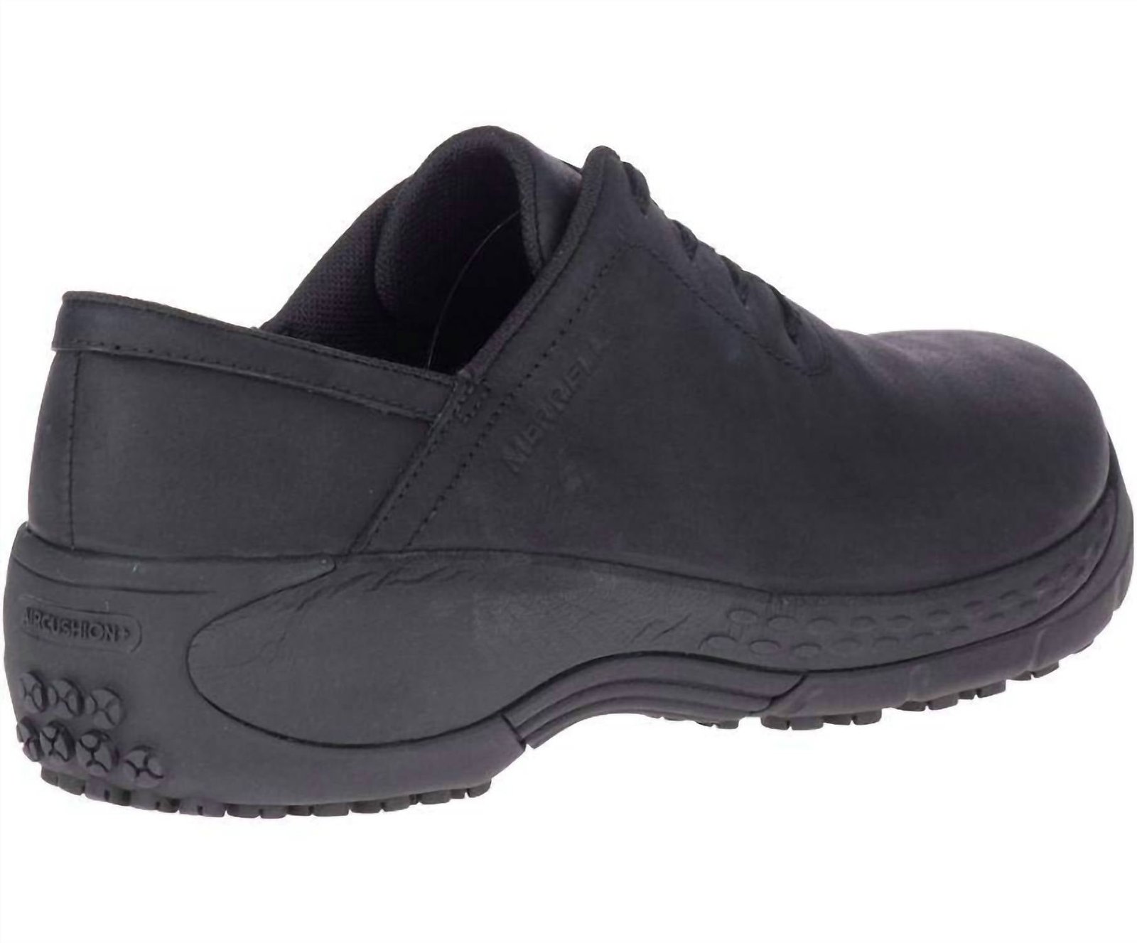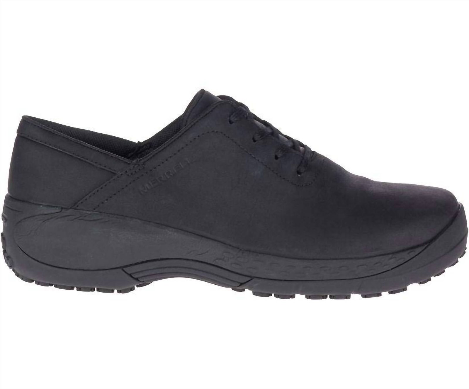 Loafers so versatile you can wear them with just about anything.Discover the Women's Encore 2 Lace Non Slip Work Shoe by Merrell, expertly crafted to combine style and functionality. These black shoes feature full grain water-resistant leather uppers with a traditional lace closure adorned with metallic eyelets for a secure fit. Prioritizing comfort, they are lined with breathable mesh and include the COMFORTBASE? footbed and Air Cushion+ system for all-day support. The Merrell M Select? PRO GRIP outsole offers slip and oil resistance, ensuring safety with every step. With a weight of just 1lb per pair, these shoes are perfect for travel season.