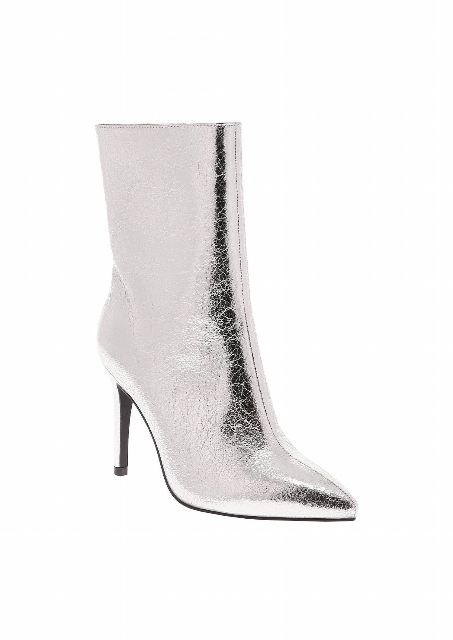 A stylish boot with a comfortable fit and the perfect amount of height. These classic boots are the perfect addition to any outfit and can be worn season after season.Elevate your fall wardrobe, featuring a sleek almond-toe silhouette that epitomizes sophistication. Stunning heeled boots come in a metallic silver finish, resting on a comfortable 3.1-inch stiletto heel, perfect for a night out or a New Year's Eve celebration. Designed with an anatomically contoured footbed, provide both style and comfort. Ideal for concerts or embracing the Y2K trend.