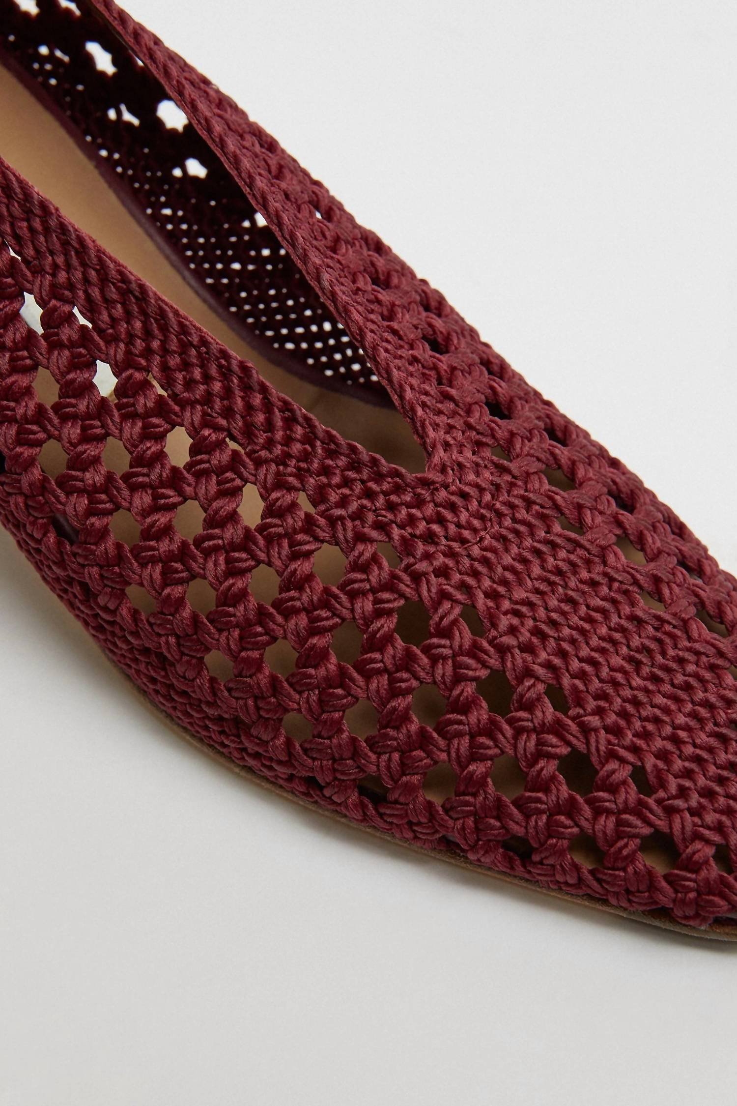 Don't be deceived, these heels are comfy as can be.A handwoven cotton mix macrame upper, these heels feature a plunging soft V-shape design and elegantly elongated squared toe. Composition includes synthetic leather (cotton) for the upper, calf leather lining, and a robust leather outsole with a rubber-invected toe for added durability. Heel Height: 5 cm/2 in. Proudly made in Portugal.