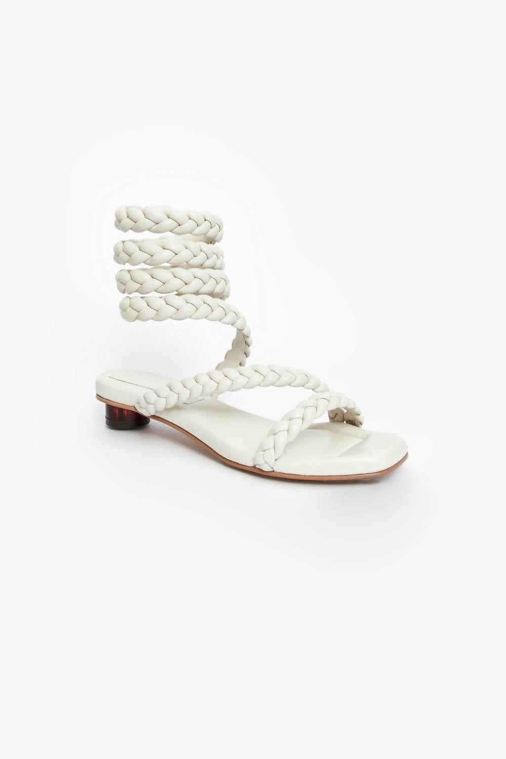 This sandal will take you from brunch to dinner and everything in between.Introducing the Women's Roma Sandal by Nora Lozza, a sophisticated choice in off-white that exudes elegance. These sandals are crafted from premium leather and uniquely feature chunky padded and braided straps. Handmade in Colombia, they boast a mini cylindrical heel of 0.98 inches, offering both comfort and style. Perfect for adding a touch of luxury to any outfit.
