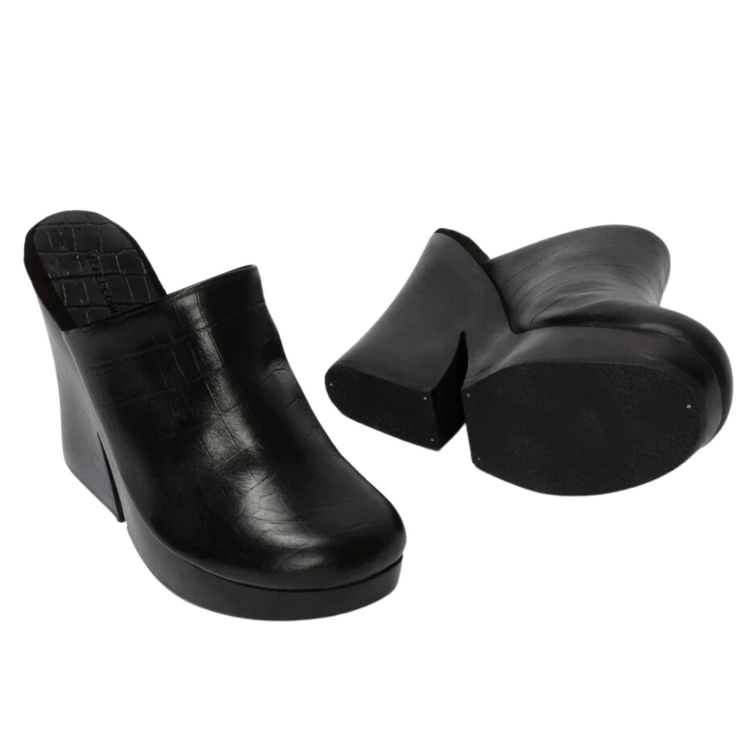 Slip them on and go! Rachel Comey Toman ClogLeather in Black Croc Print ClogsClosed-ToeHigh Curved HeelChunky Carved Wood Split PlatformRubber SoleTrue to Size for Narrow FeetUp Half a Size for Mid-Wide Feet120mm Heel30mm PlatformMade in Peru