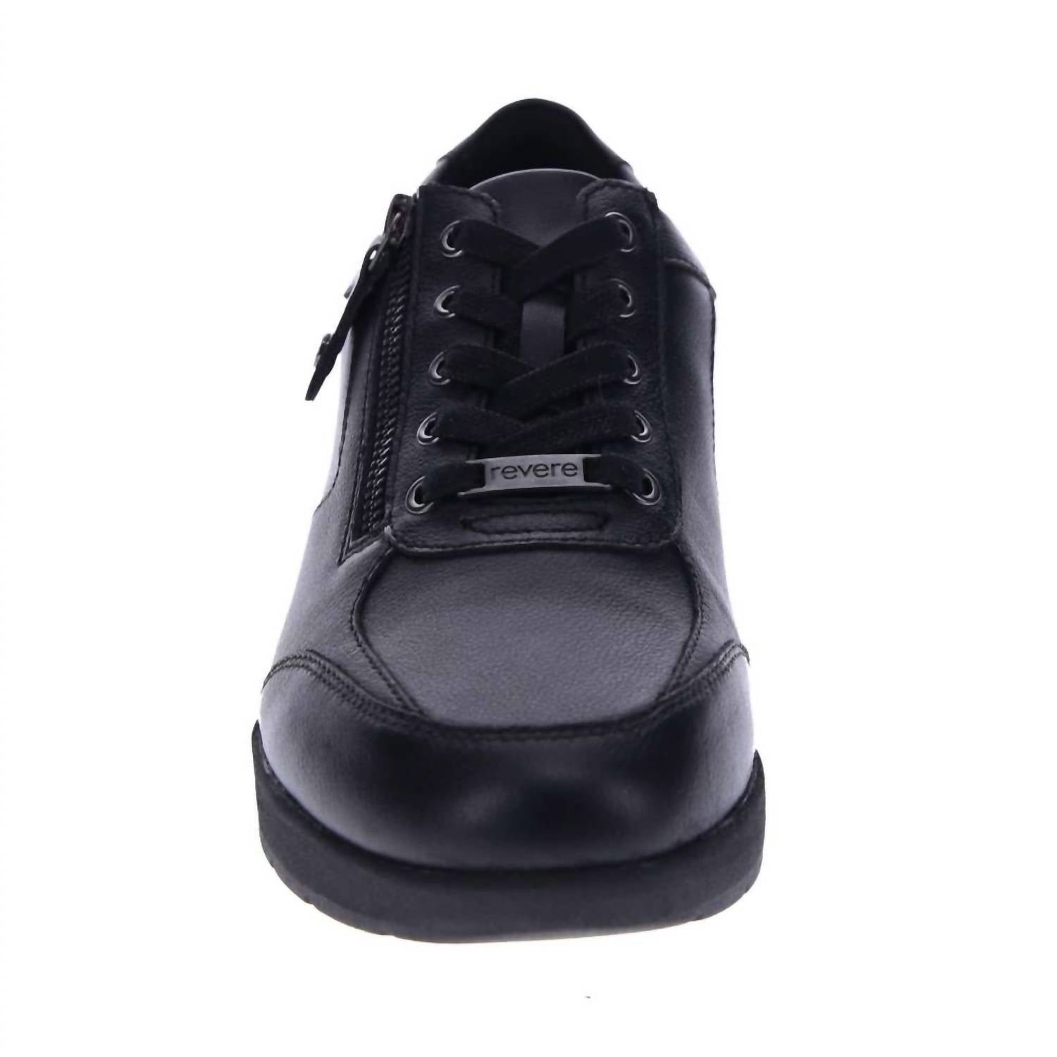 Cute, functional, and comfortable. These sneakers check all the boxes.Step into comfort with the Women's Boston Zip Sneaker by Revere, crafted in timeless Black French Faux Leather for a minimalistic style ideal for travel or spring wear. Featuring adjustable uppers for a custom fit, these sneakers accommodate both medium (B) and wide (C) widths. With a removable comfort footbed and slip-resistant outsole, this orthotic-friendly design provides versatility and support with its built-in arch and forefoot cushion zone. Heel height is a comfortable low wedge, and care instructions specify wiping with a damp cloth and air drying under indirect sunlight. Available in women's whole sizes 5-12, half sizes should order up.
