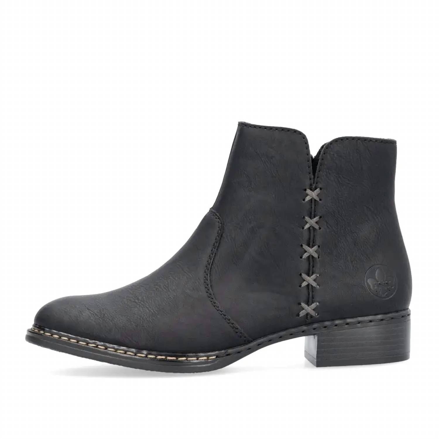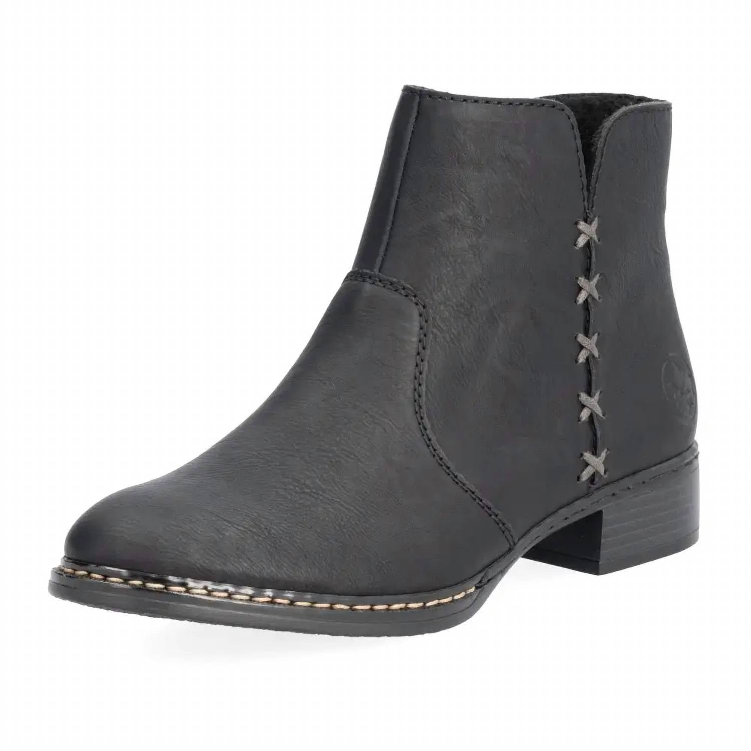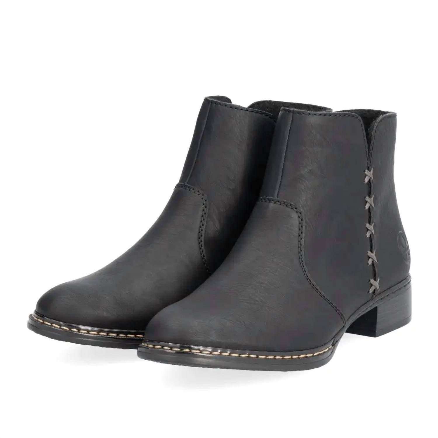 Say hello to the perfect, most versatile boot. The ankle height makes this style easily transition from day to night. Wear them with your favorite skinny jeans and tee for a more laid back look, or pair them with your favorite mini dress and jacket for a night out on the town.Experience the sophisticated charm of the Women's Conny 75 Ankle Zip Boots by RIEKER, crafted for both elegance and practicality. Featuring a schwarz/smoke synthetic upper adorned with fine decorative stitching and the brand's logo, these boots exude understated style. With a functional zipper closure for swift wear, they promise convenience on busy days. Completed with a 3.1 inch block heel, these boots sport a round toe and medium shoe width for comfort.
