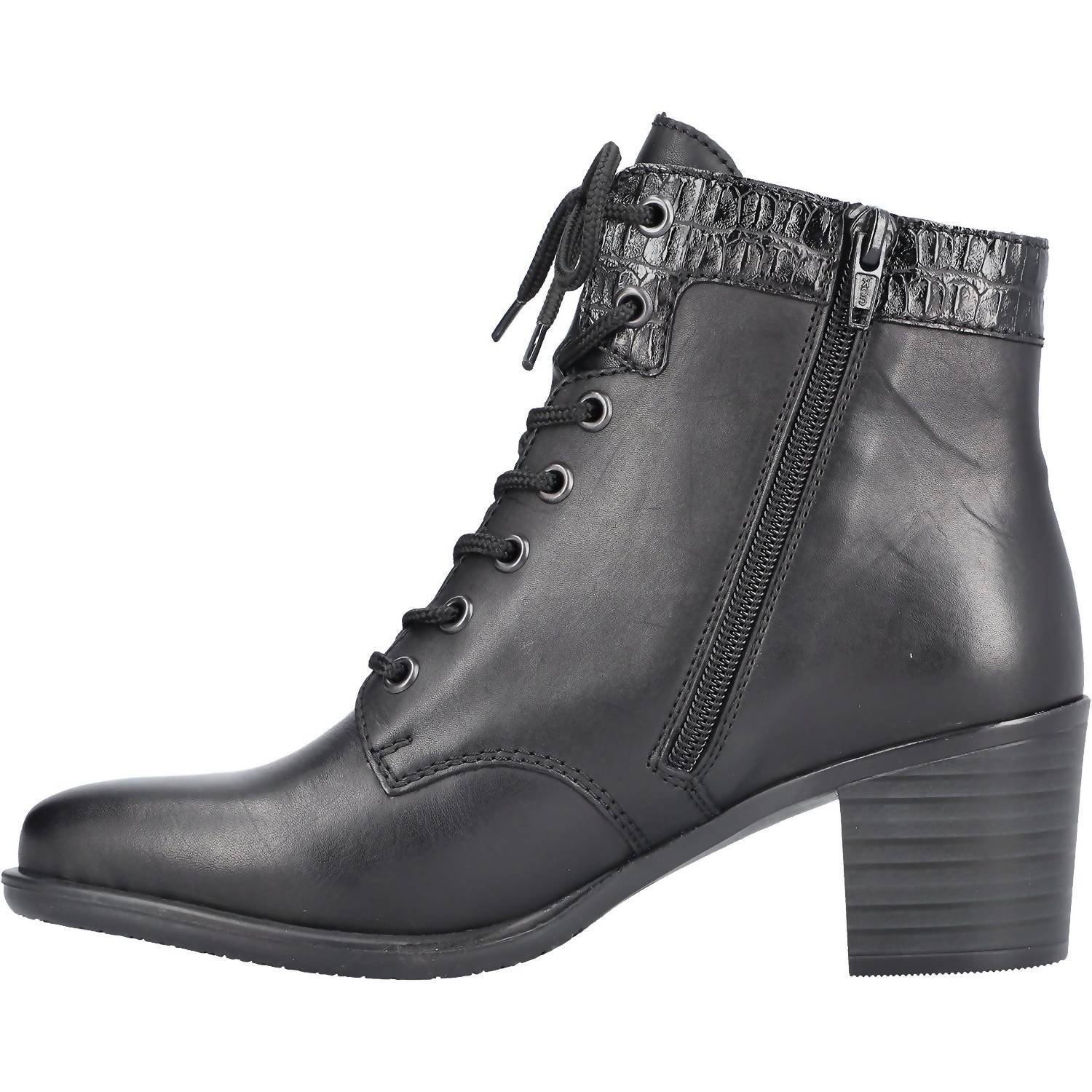 Say hello to the perfect, most versatile boot. The ankle height makes this style easily transition from day to night. Wear them with your favorite skinny jeans and tee for a more laid back look, or pair them with your favorite mini dress and jacket for a night out on the town.Introducing the Women's Ines 40 Faux Leather Ankle Boots by RIEKER, a stylish choice for evening events. These mid-height block heel boots in classic black feature a synthetic upper and textile lining, crafted for comfort and flexibility. Designed with an almond toe shape and easy side zip closure, they adapt effortlessly to your seasonal wardrobe. Embrace minimalist trends with RIEKER's anti-stress technology, offering lightness and superior cushioning for all-day wear.