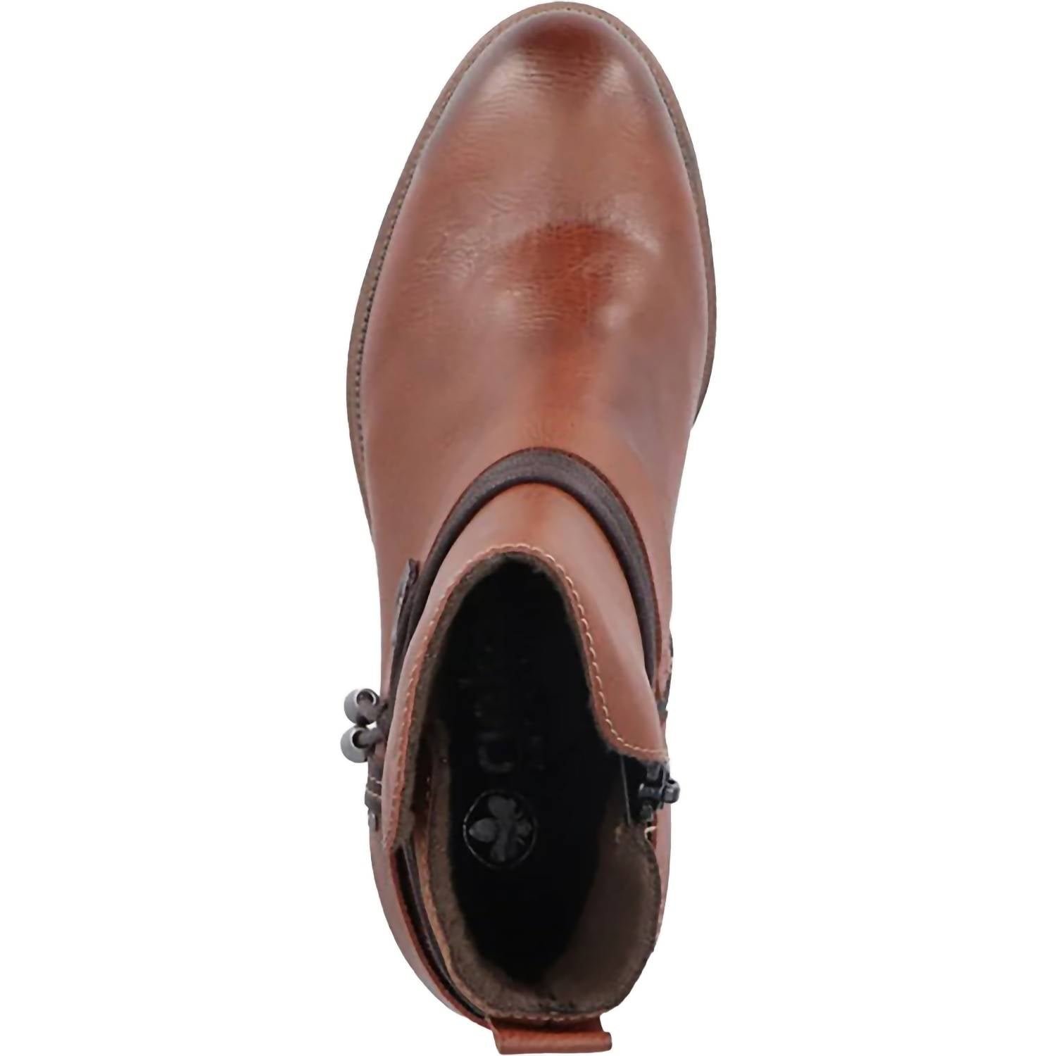 Say hello to the perfect, most versatile boot. The ankle height makes this style easily transition from day to night. Wear them with your favorite skinny jeans and tee for a more laid back look, or pair them with your favorite mini dress and jacket for a night out on the town.Step into style with the Women's Kylie 80 Ankle Boots by RIEKER, featuring a chic blend of muskat, brandy, and havanna colors. These ankle boots are crafted from durable faux leather, finished with a functional zipper closure for easy wear. Enjoy a comfortable 2.2′ block heel that offers both style and all-day comfort, complemented by a thermoplastic elastomer outsole for reliable traction. Perfect for fall dinner parties, these boots add a fashionable touch with their trendy cord detail and are a nod to 90s fashion.
