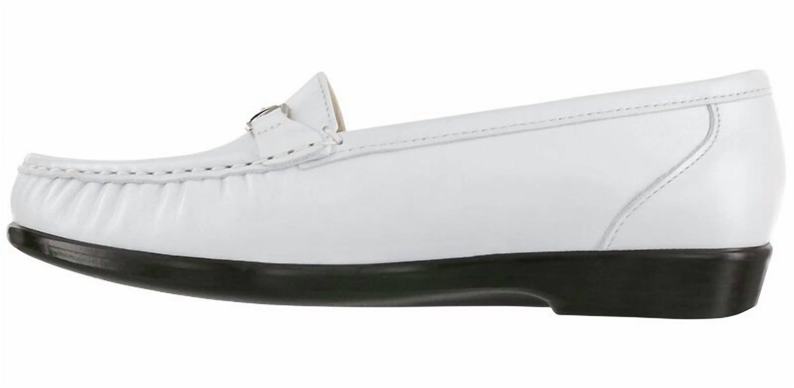 A classic loafer that is both comfortable and polished.Discover the Women's Metro Slip On Loafer by SAS in a sophisticated Pearl White shade, expertly crafted with a genuine moccasin construction. Made from soft leather, this loafer wraps comfortably around the foot and features an almond toe shape. Designed for all-day comfort, it includes a removable cushioned footbed and a shock-absorbing sole supported by a flat 1-inch heel. Perfect for the fall season, this stylish footwear is both elegant and practical, accentuated by a polished premium adornment on top.