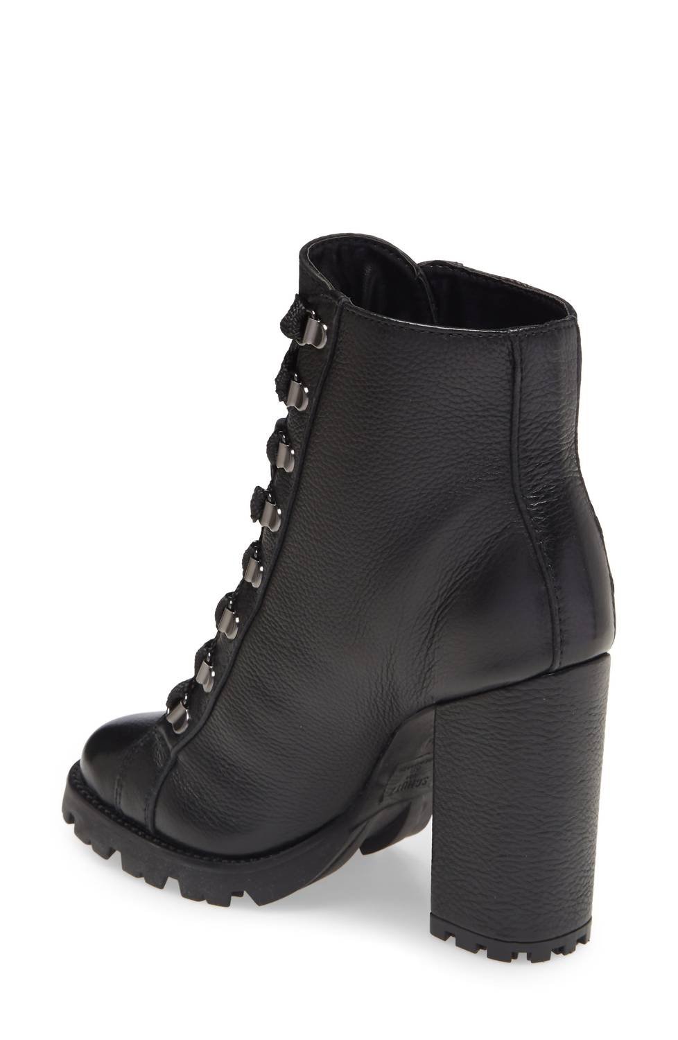 Say hello to the perfect, most versatile boot. The ankle height makes this style easily transition from day to night. Wear them with your favorite skinny jeans and tee for a more laid back look, or pair them with your favorite mini dress and jacket for a night out on the town.Step into bold style with the Women's Zhara Combat Lug Sole Lace Up Bootie by SCHUTZ, designed to make a statement in classic black. This striking boot features wide woven laces that weave up a take-charge vamp, complemented by a commanding 4.25-inch stacked block heel and a trend-right utilitarian sole. The boot is crafted with a leather upper, synthetic and leather lining, and a durable rubber sole. Perfect for concerts and embracing the grunge trend, this bootie is proudly made in Brazil.
