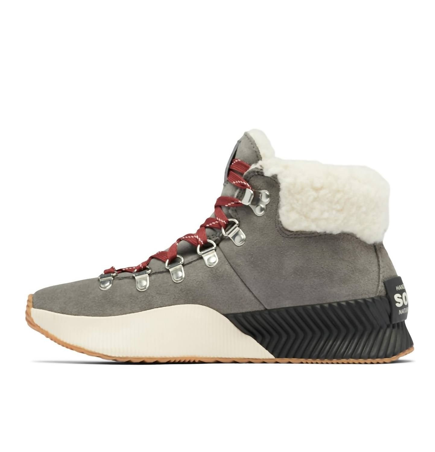 A stylish lace-up boot with a comfortable fit and classic design. Versatile enough to wear with almost every outfit, your closet and feet will be thanking you.Experience winter with confidence in the Women's Out N About III Conquest Boot by SOREL, featuring a round toe and iconic hiker upper design in a sophisticated gray. Crafted with waterproof suede upper, faux shearling collar, and microfleece lining, these boots ensure warmth and style. The removable molded EVA footbed, PU midsole, and handcrafted herringbone outsole provide comfort and enhanced traction, perfect for wintry conditions. With a convenient lace-up closure, these boots sport a heel height of 1.5 inches and a platform height of 1.25 inches, offering both style and stability.