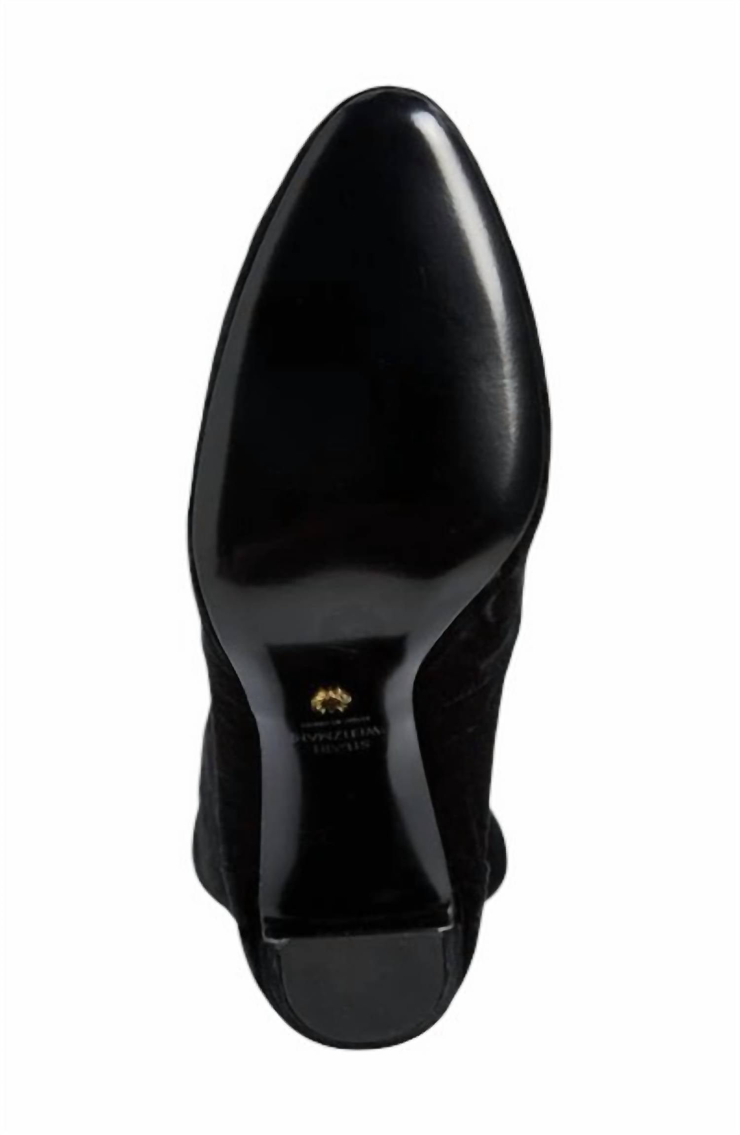 A stylish boot with a comfortable fit and the perfect amount of height. These classic boots are the perfect addition to any outfit and can be worn season after season.Step into sophistication with the Women's Vidaland Stretch Crushed Velvet OTK Boots by STUART WEITZMAN. These black over-the-knee boots feature a 4.5′ block heel and a convertible 23′ shaft that can be adjusted with a dainty tie closure at the back. The luxurious leather upper and leather sole, complemented by a textile lining, ensure both style and comfort. Made in Spain, these boots are perfect for New Year's Eve or any evening event, embodying the chic essence of 90s fashion.