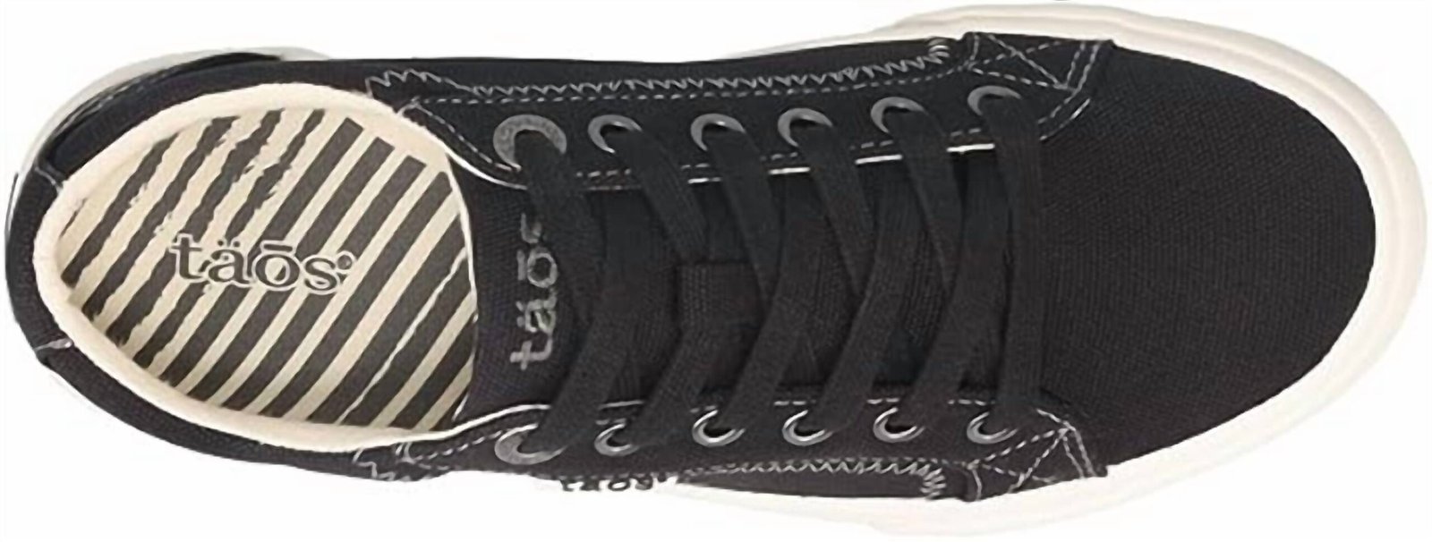 Cute, functional, and comfortable. These sneakers check all the boxes.Step into comfort and style with the Taos Women's Plim Soul Sneakers in classic black. These canvas sneakers feature a premium removable footbed with arch and metatarsal support, offering orthotic-friendly wear. With a heel height of 1 1/8′ and a weight of 11.2 oz per shoe, they boast a flexible, durable rubber outsole for long-lasting use. Care for these streetwear favorites by spot cleaning the upper with a damp cloth.