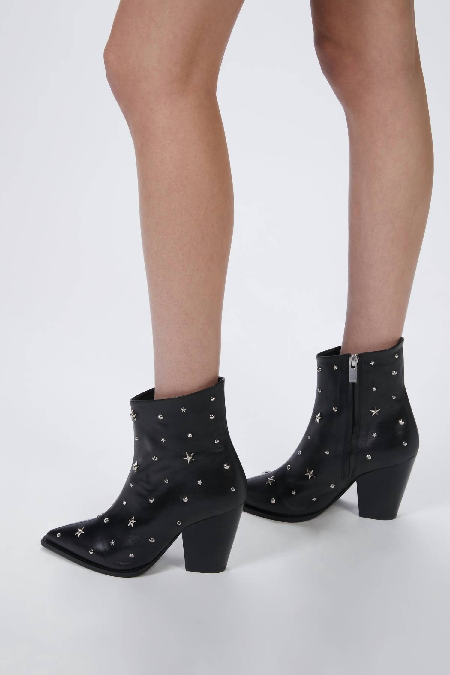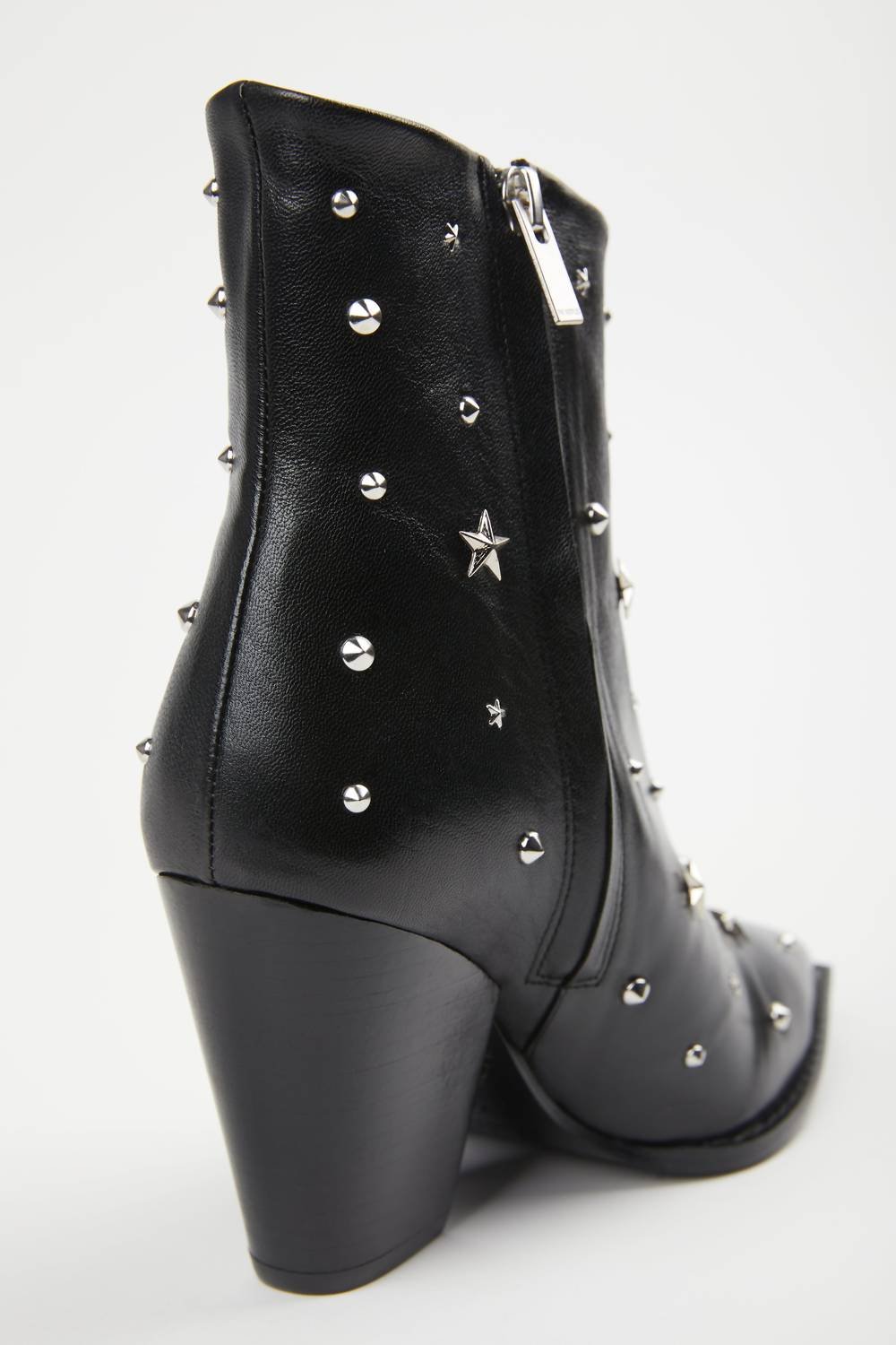 Step out in confidence and showcase your impeccable taste with these fashionable and versatile boots. Their classic style will have you reaching for these boots season after season.Punctuated with platinum-toned studs, these leather boots from The Kooples?go from nice-to-have, to must-have. Add a little lift to your next look with the slanted, western-inspired heel and sleek pointed toe. Crafted from smooth black goat leather, style yours with supremely feminine dresses for an unexpected twist.?90mm (3.5′) heel?Fabrication: Exterior - 100% Goat Leather; Sole - 100% Leather CowEuropean SizingMarissa is wearing size EU 38