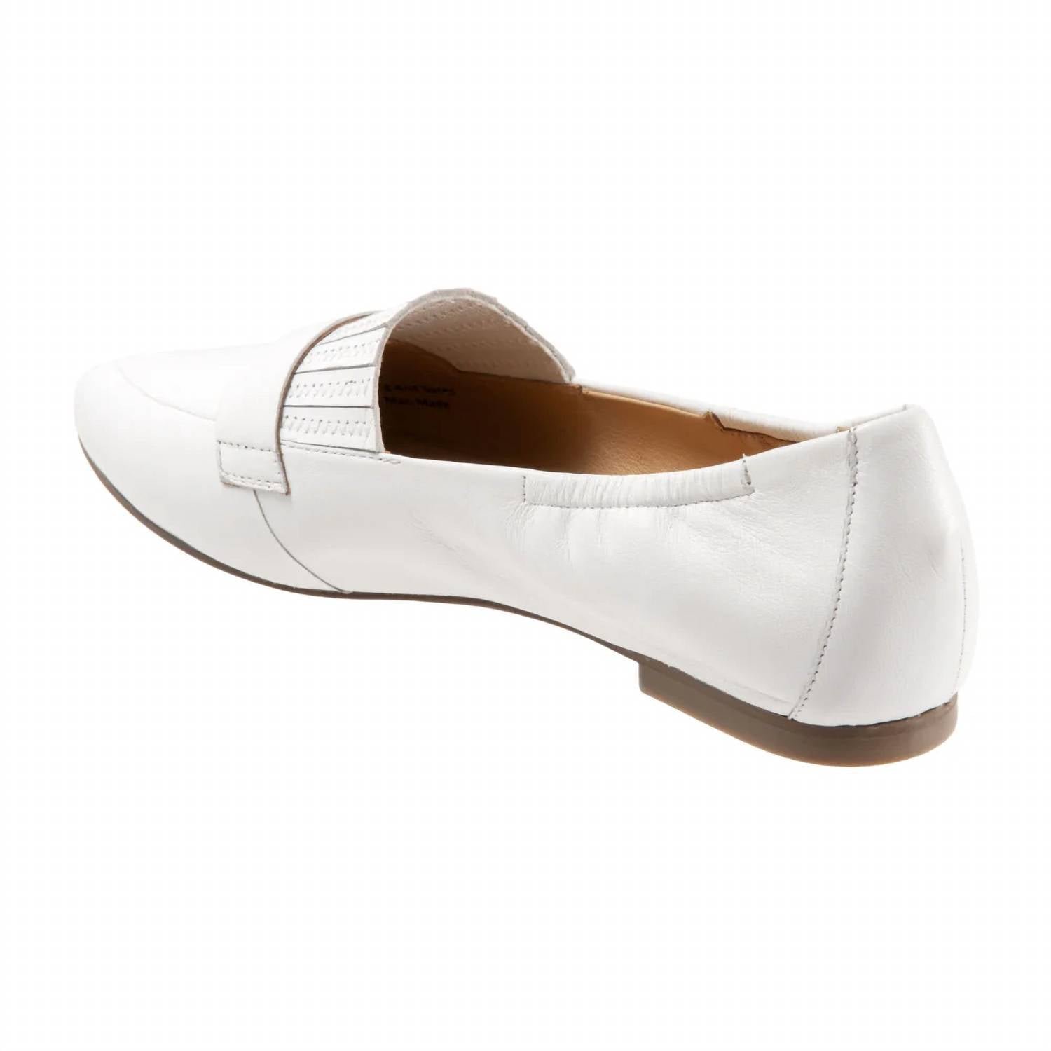A preppy yet feminine take on the classic loafer.Step into style with the Trotters Women's Emotion Leather Slip-on Shoes, a chic choice in pristine white. The shoes feature a leather upper and lining, complemented by elastic goring for improved flexibility. Engineered with a cushioned sueded leather footbed and a durable rubber sole for comfort, each shoe is designed with an elasticized topline for a snug fit. The pointed toe and understated 3/8′ flat heel enhance its elegant design, making it a sophisticated addition to any wardrobe.