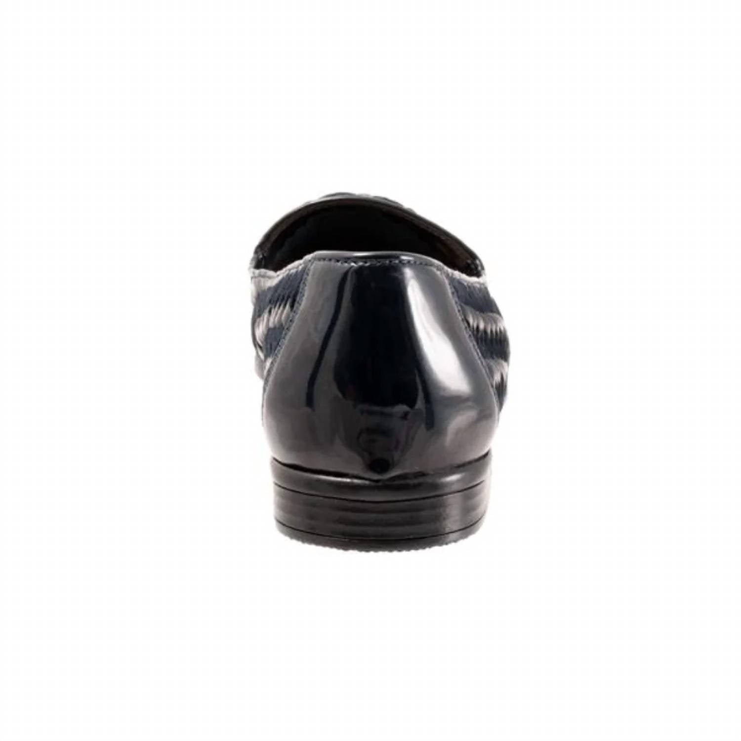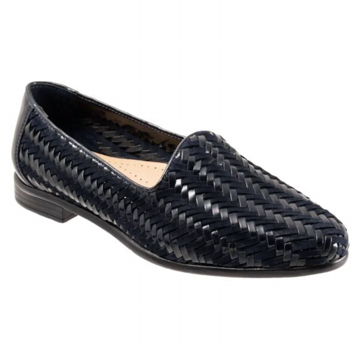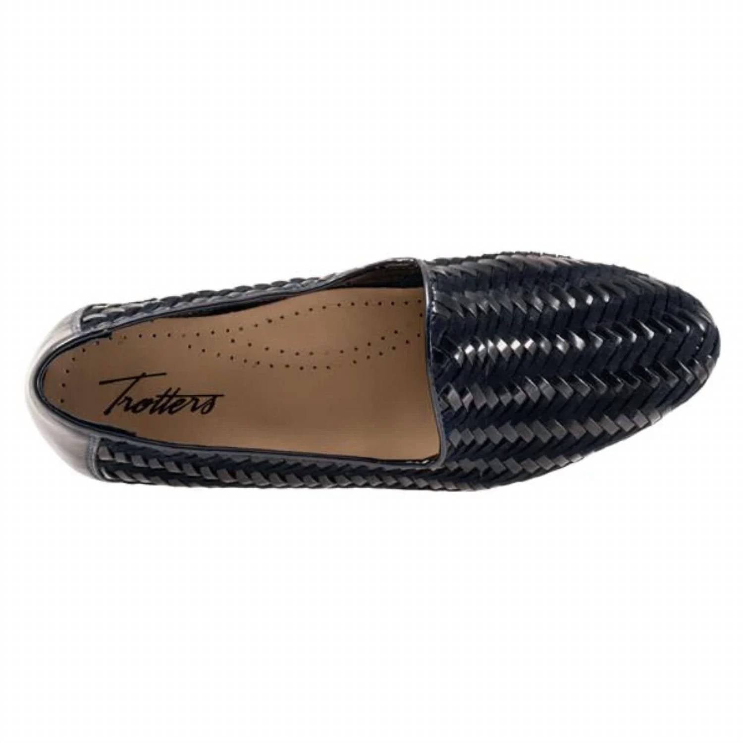 A classic loafer that is both comfortable and polished.Step into style and comfort with the Women's Liz III Leather Shoes by Trotters, crafted in a sophisticated navy/navy patent color. These flats feature a cushioned leather footbed and a leather upper, offering both comfort and elegance. The 5/8′ flat heel is lightweight and flexible with a rubberized sole, ensuring all-day wearability. Designed with a wide fit and a classic round toe, these shoes are a stylish choice for any occasion.