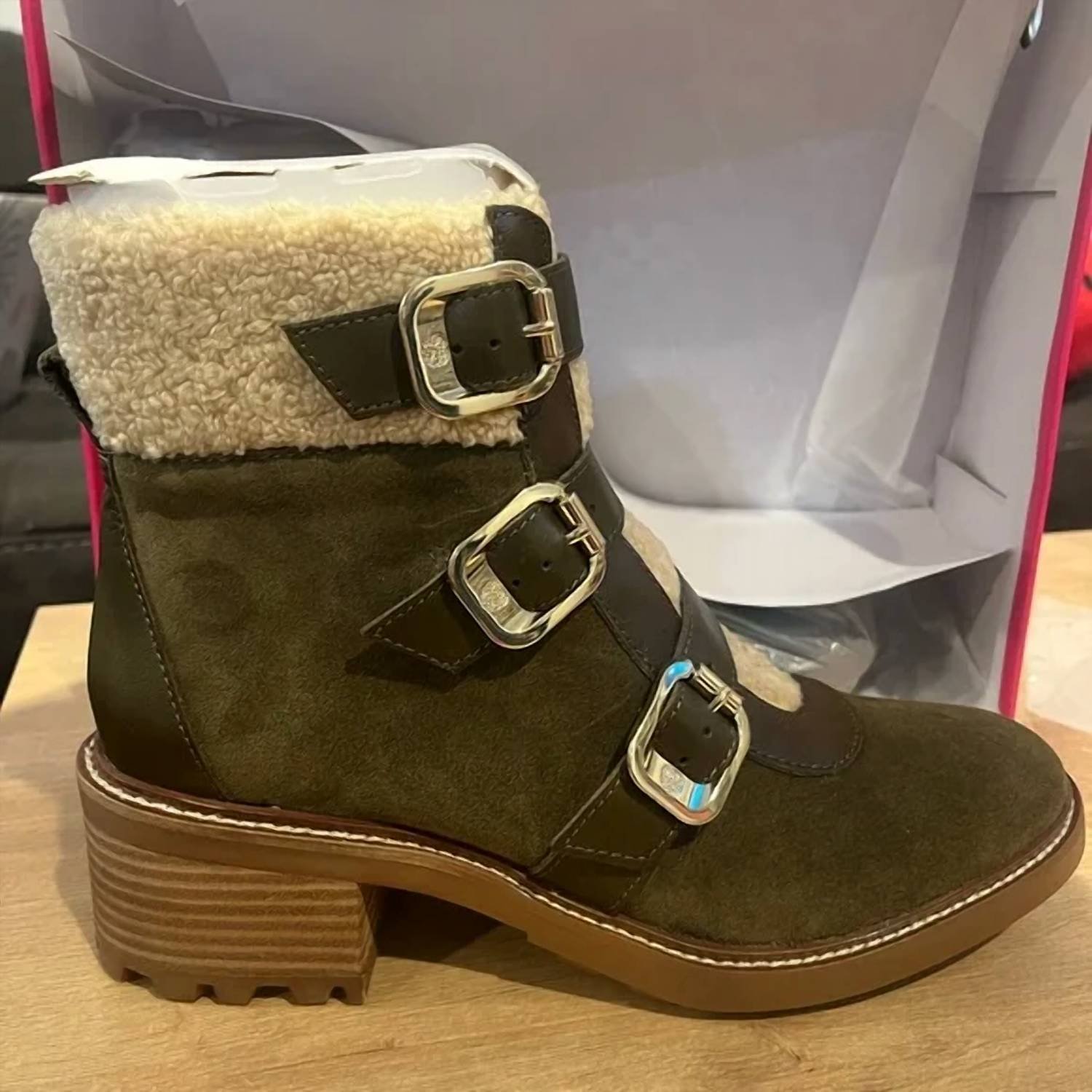 A stylish boot with a comfortable fit and the perfect amount of height. These classic boots are the perfect addition to any outfit and can be worn season after season.Elevate your winter wardrobe with the Women's Klerica Leather Boots from Vince Camuto, expertly crafted from olive faux leather for a chic, textured finish. Designed with a faux fur lining, almond toe, and flat heel, these mid-height heeled boots are perfect for staying warm and stylish during all your adventures. The lug bottom and buckle accents add a rugged flair, making them an essential part of your cold-weather attire. These boots arrive wrapped for your convenience, ensuring you step out in style every time.