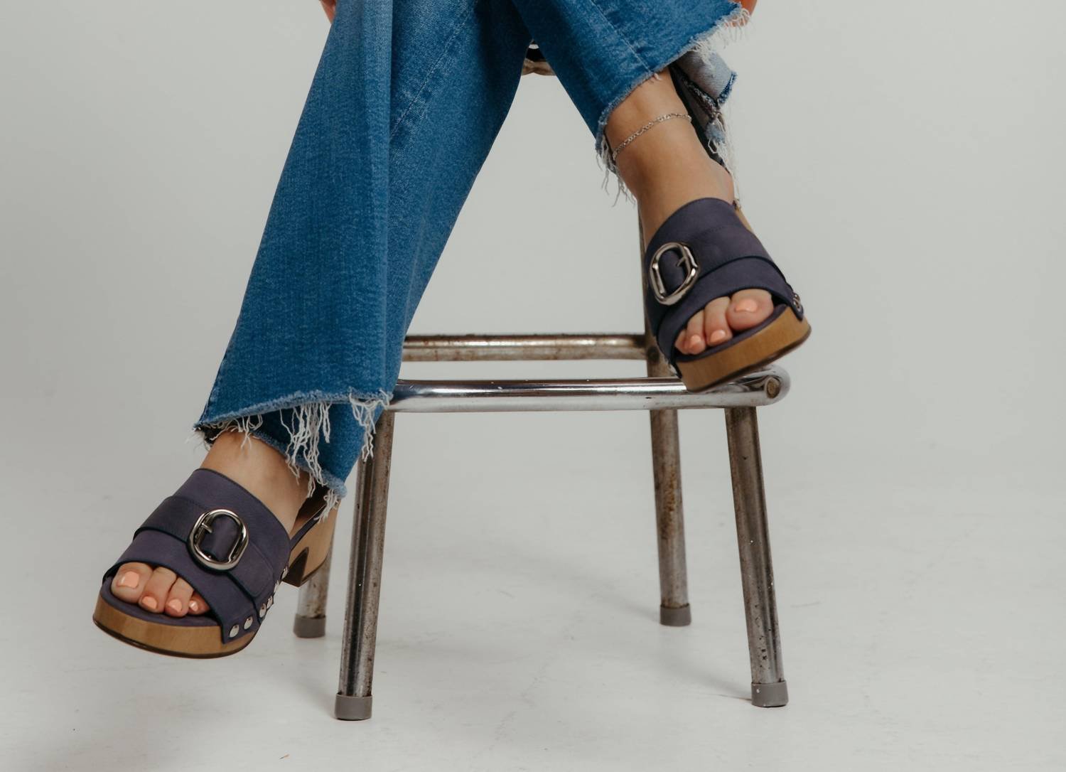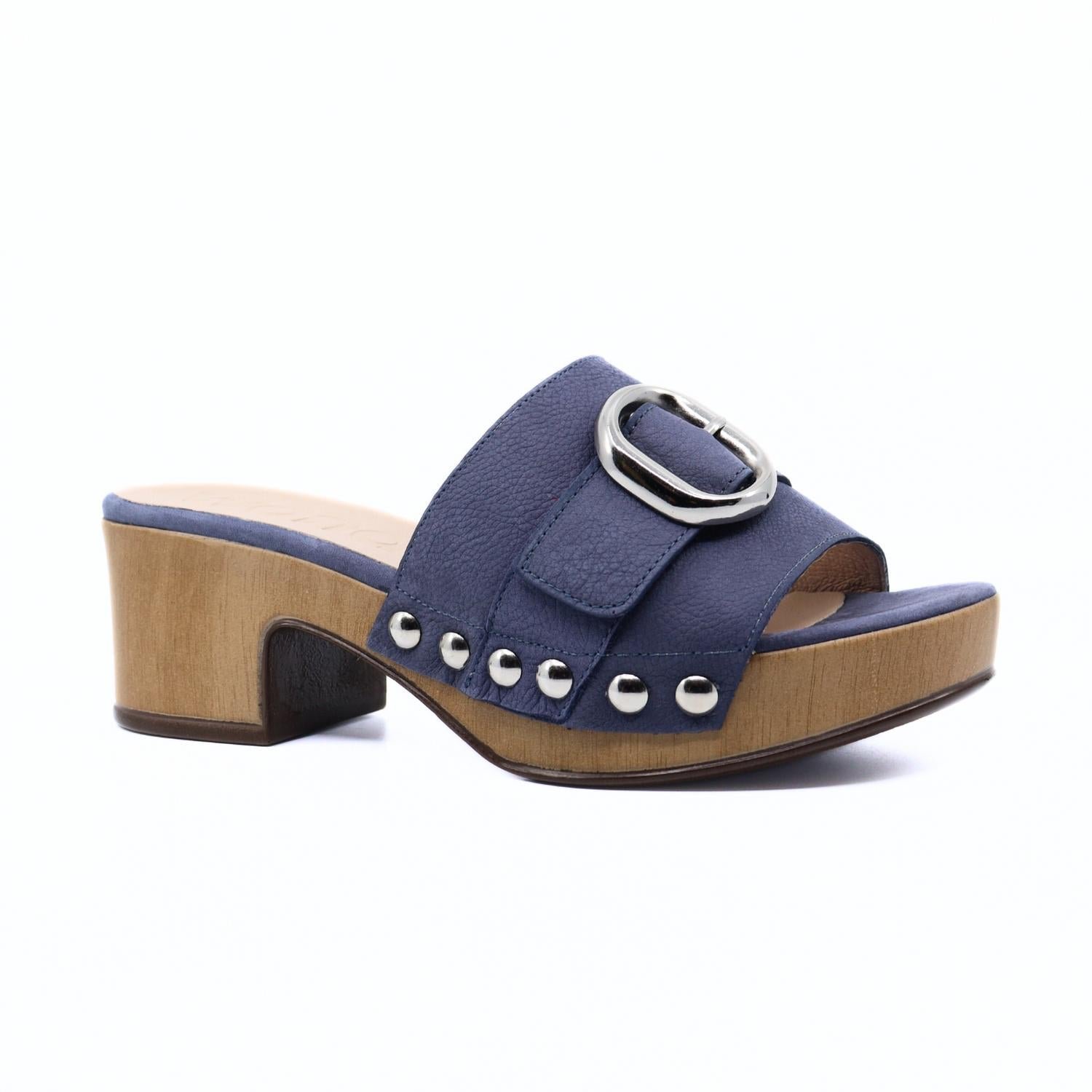 Slip them on and go! Step into elegance with the Baltic Studded Women's Clog by Wonders, crafted from sophisticated blue nubuck leather. These clogs feature a low, wide block heel at 2.5 inches, designed with a wood-effect finish for added stability and vintage charm. The metallic buckle and decorative studs complement the refined look, while the MemoryGel insole ensures all-day comfort. Ideal for spring occasions, these stylish mules bring versatile flair to any wardrobe.