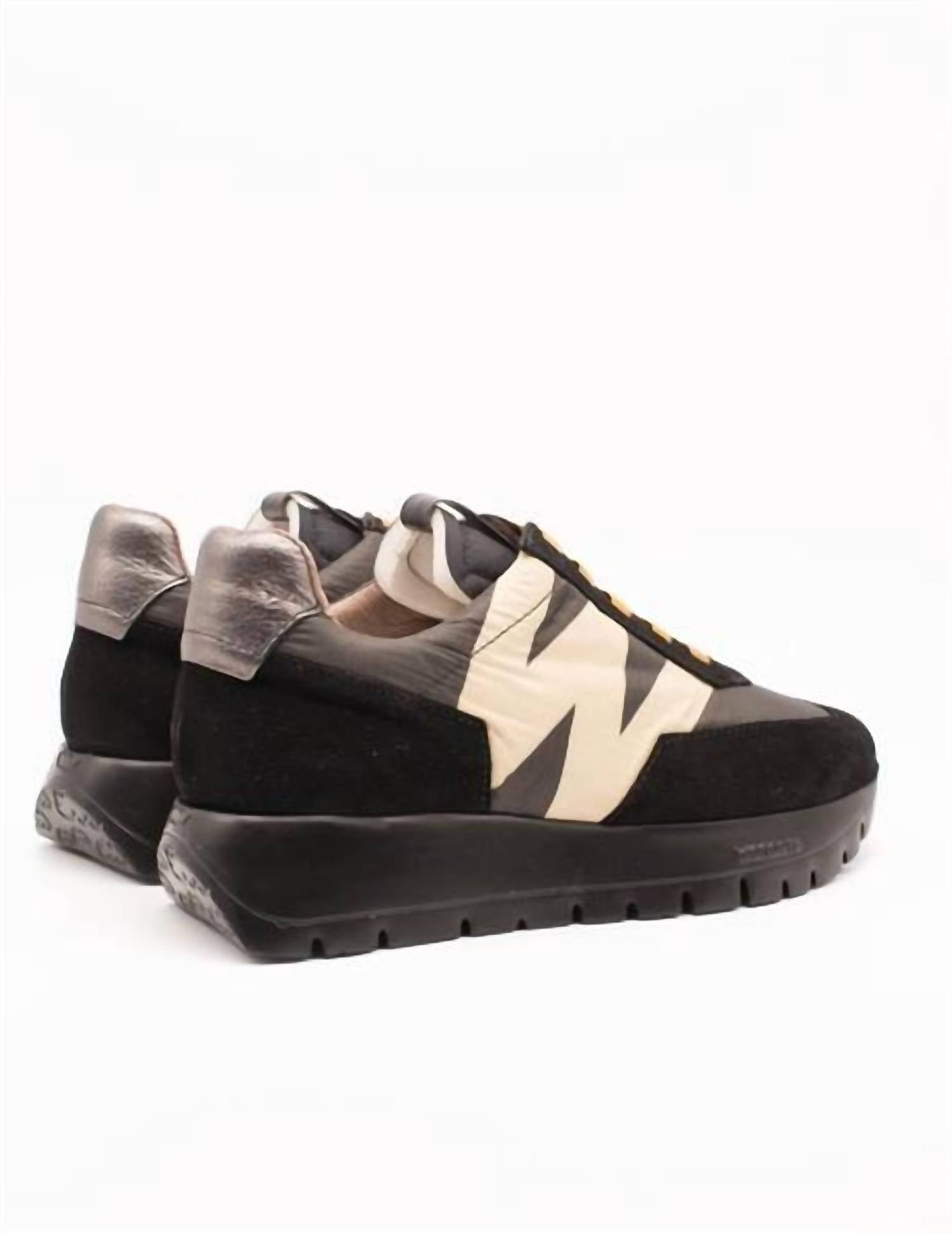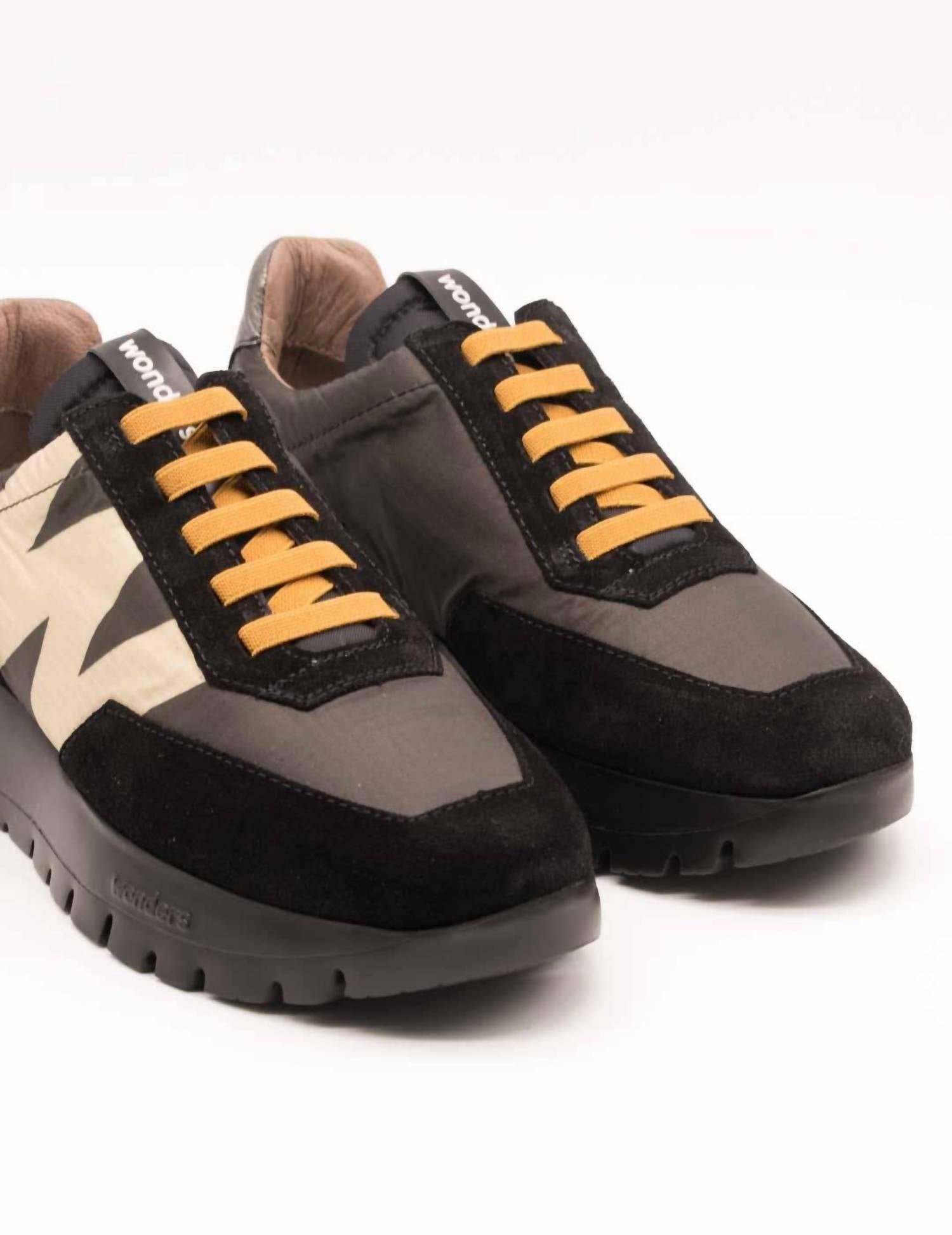 Get your daily steps in with these adorable sneakers.Step into comfort and style crafted in black and beige suede leather and nylon. Featuring an elastic drawstring closure and a sleek logo print. Offer a perfect blend of elegance and functionality. WondersFly technology provides a 2.5-centimeter rubber outsole for a comfortable stride, while the removable MemoryGel insole cushions your feet. Streetwear-inspired shoe pairs perfectly with your game day ensemble, offering durability and a touch of sophistication. Exterior composition: 50% cowhide and 50% nylon; Interior composition: 50% leather and 50% microfiber.